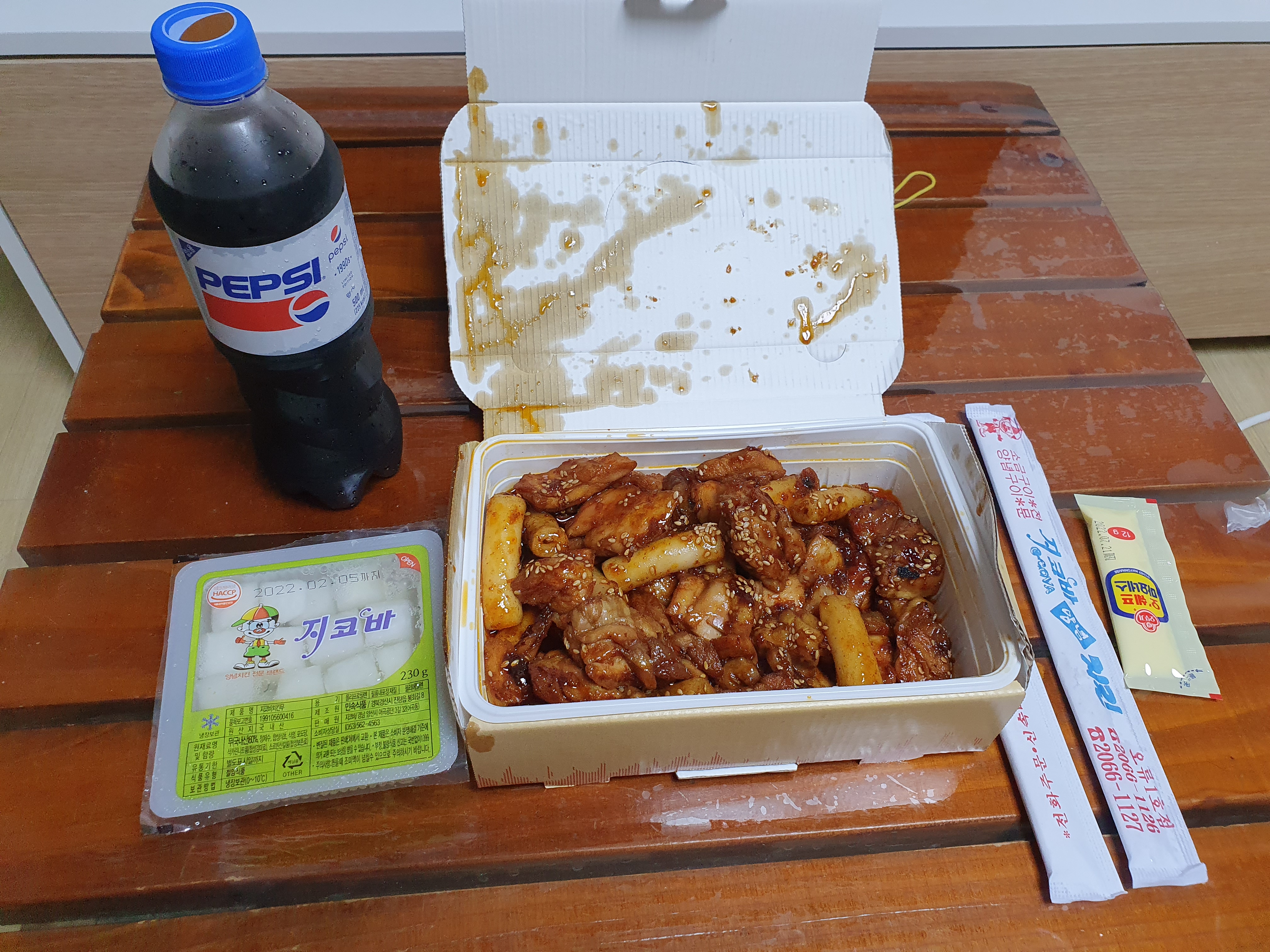 비닐에서 꺼낸 구성은 위에 사진과 같습니다. 치킨무 팹시 콜라 순살양념치킨 마요네즈 나무젓가락 2개!!!