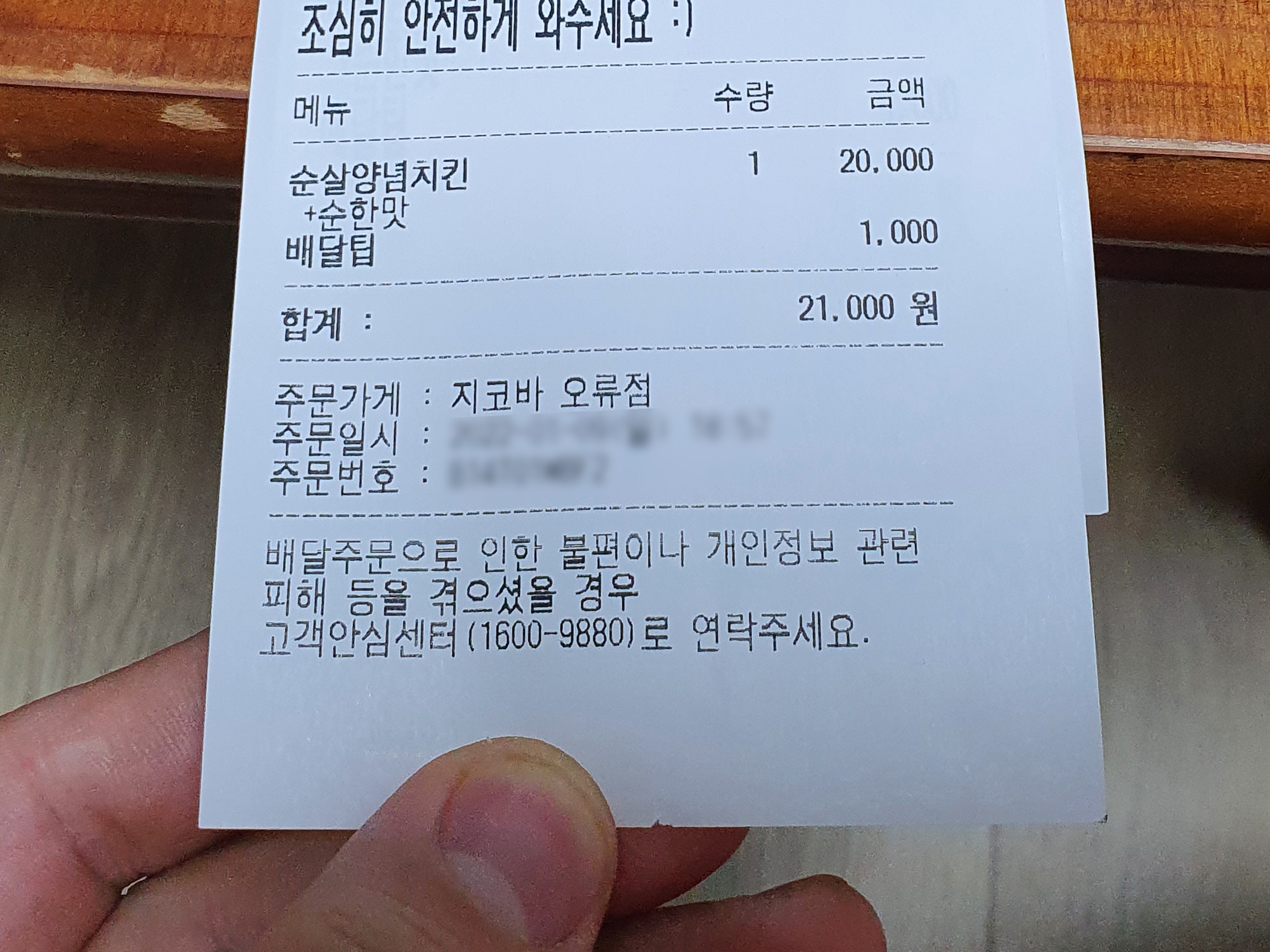 순살양념치킨 20,000원에 배달 팁 1,000원! 배달 팁이 비교적 저렴해서 마음에 들었습니다.