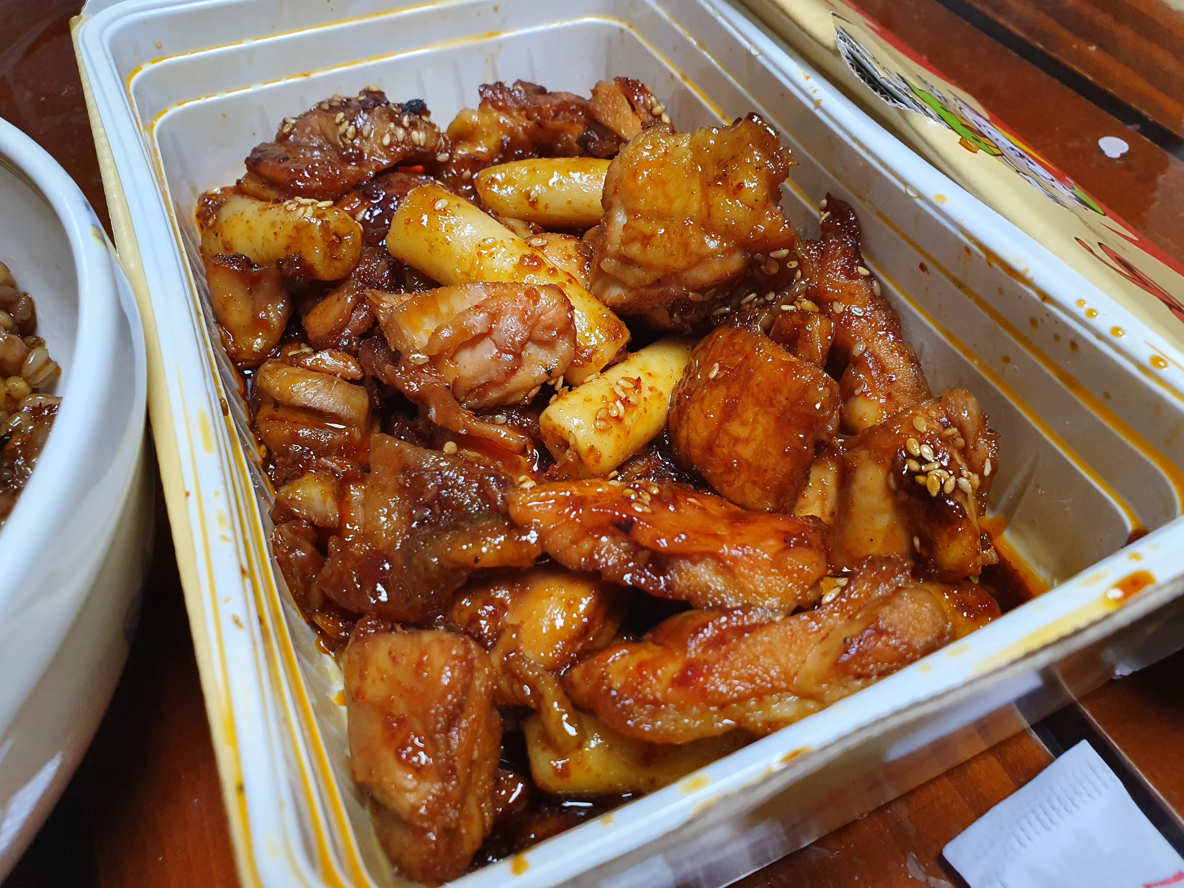 순살양념치킨이 들어있는 상자를 열었습니다. 떡볶이 떡이 있었는데 떡 중앙이 비어있었고, 그래서 그런지 양념이 잘 베여있는 것 같았습니다. 그리고 양념 듬뿍 묻은 순살치킨!!! 너무 마음에 드네요^^