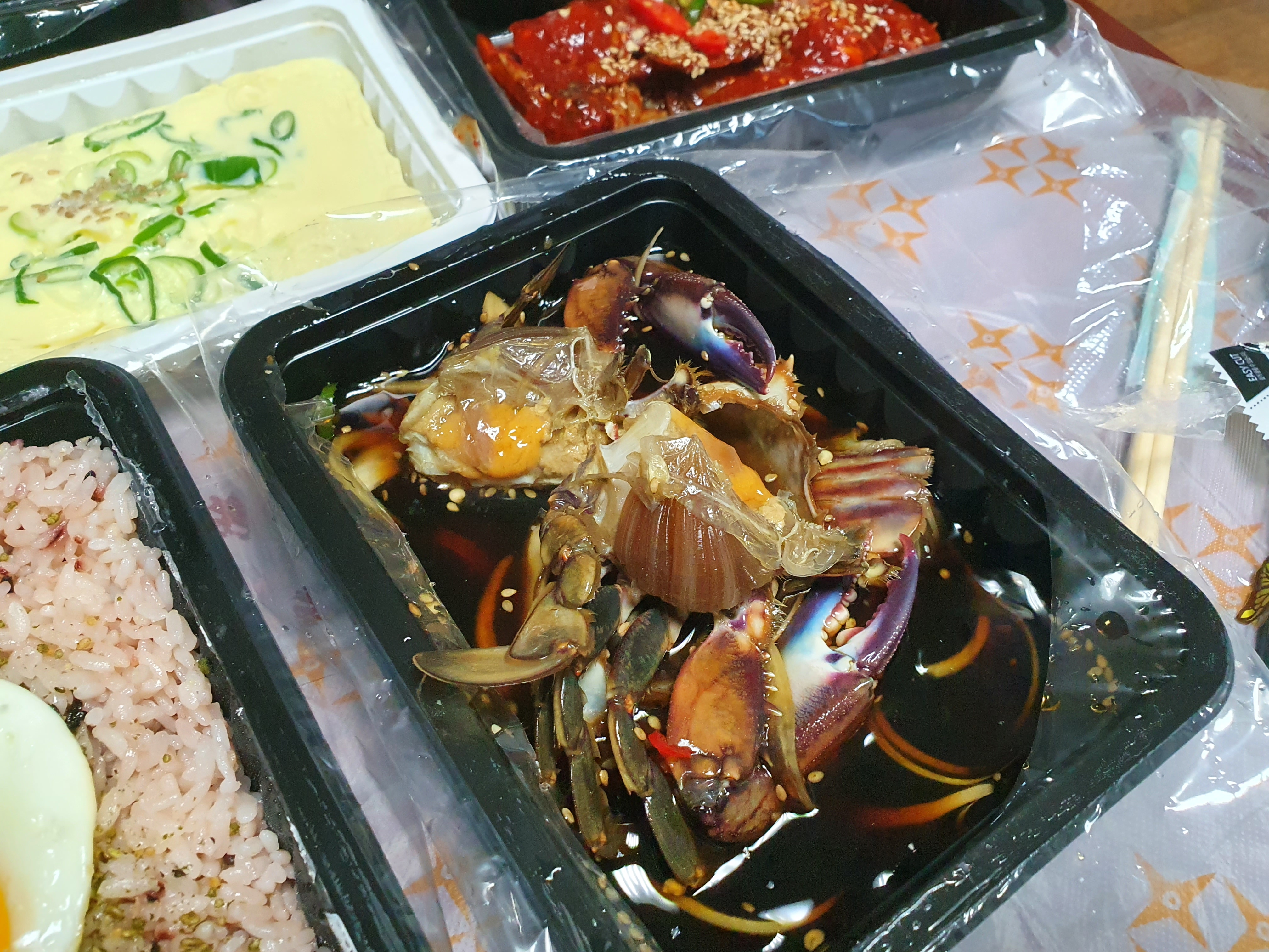 비닐 뚜껑을 다 뜯으면 위에 사진과 같습니다. 2인분이라 2개씩 왔습니다. 1인분 기준으로 설명을 하면 간장게장 1팩, 양념게장 1팩, 계란찜 1팩, 밥+계란 프라이 1팩, 콩나물 국 1팩, 알+오징어젓+마늘쫑+김가루 1팩, 간장새우 1마리, 양념 새우 1마리!!!