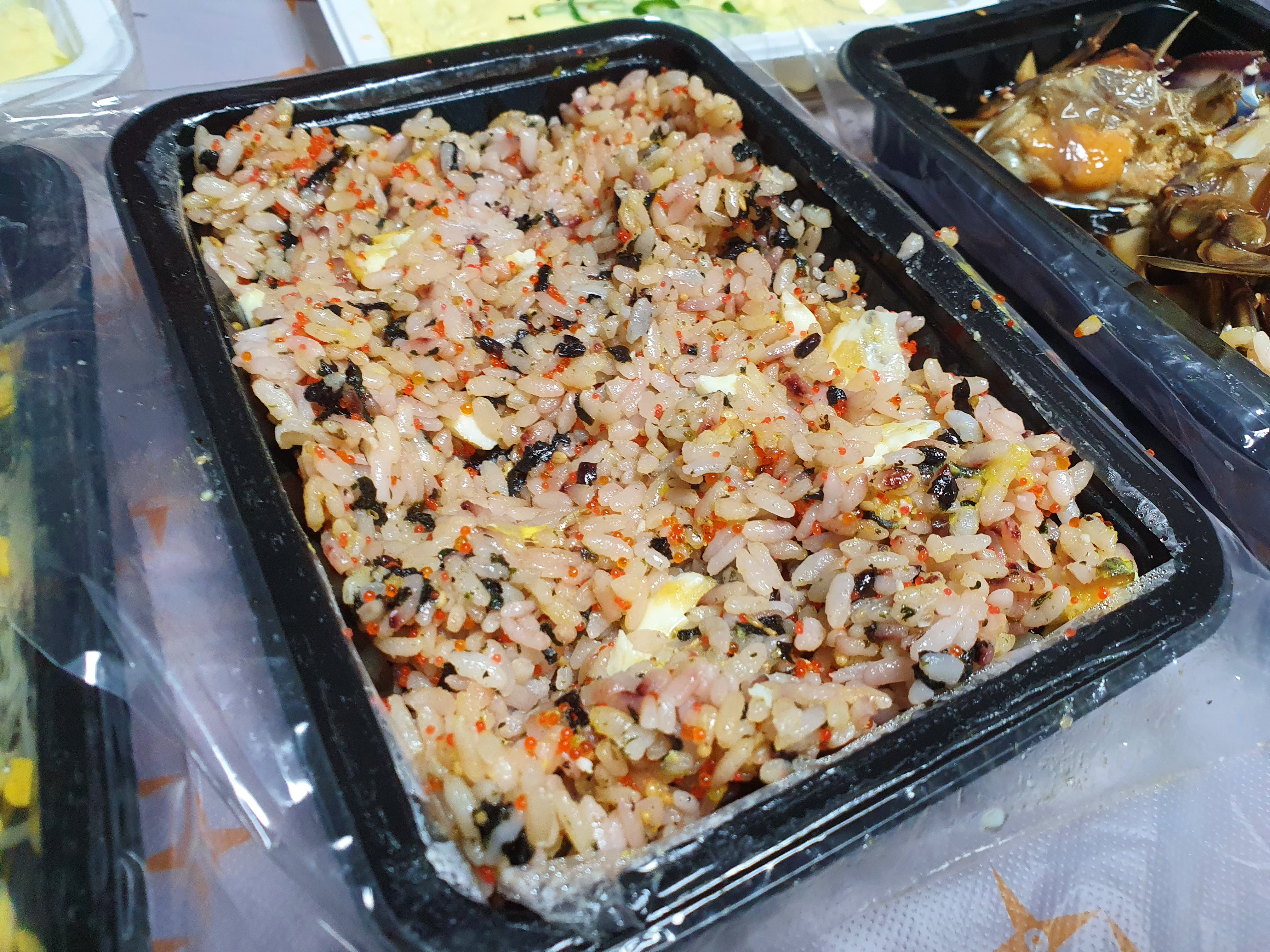 위에서 말했듯이 밥 + 계란 프라이 + 알 + 김가루를 비닐장갑을 이용해 비빈 상태입니다. 비닐장갑이 있어서 숟가락으로 비비는 것보다 간단하고 좋았습니다. 주먹밥으로 만드는 것은 귀찮으니 패스~
