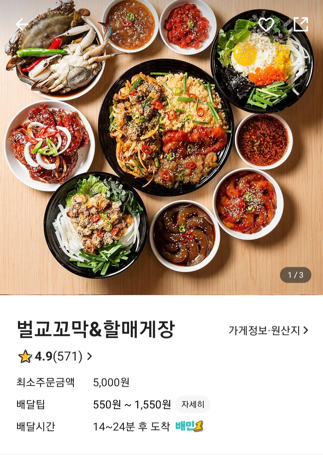 그렇게 해서 찾은 구로동 구로역 맛집 벌교꼬막&할매게장 (어머니밥상)!!! 별점이 4.9에 리뷰가 571개로 일단 주문해 먹어보기로 했죠... 배달 팁 550~1,550원 그냥 공짜로 해주시지... 여하튼 배달 팁이 싸서 좋네요.
