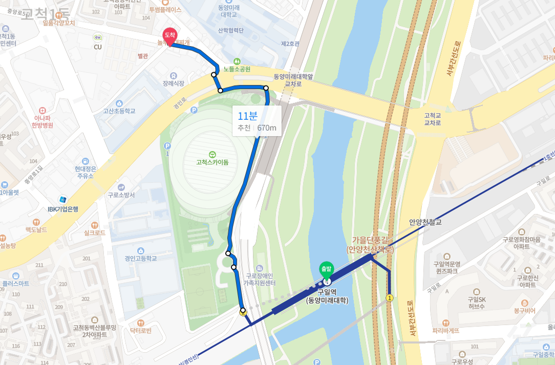 순대타운은 구일역 2번 출구로 나와 대략 10분정도 거리에 있습니다. 아래 네이버 지도에서 검색한 후 캡쳐한 이미지를 넣어두었으니 참고하세요.
