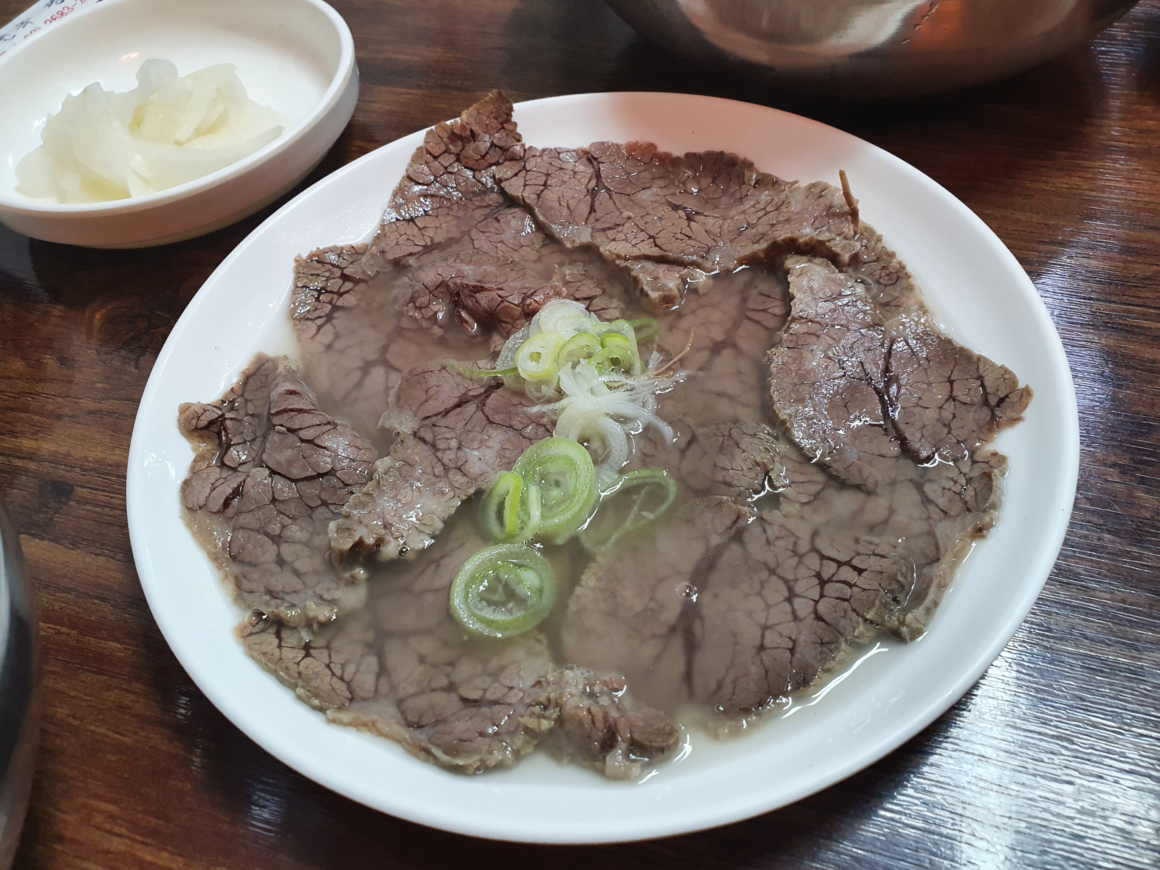 친구와 이런저런 이야기를 나누고 있을 때 차돌박이 수육부터 나왔습니다.