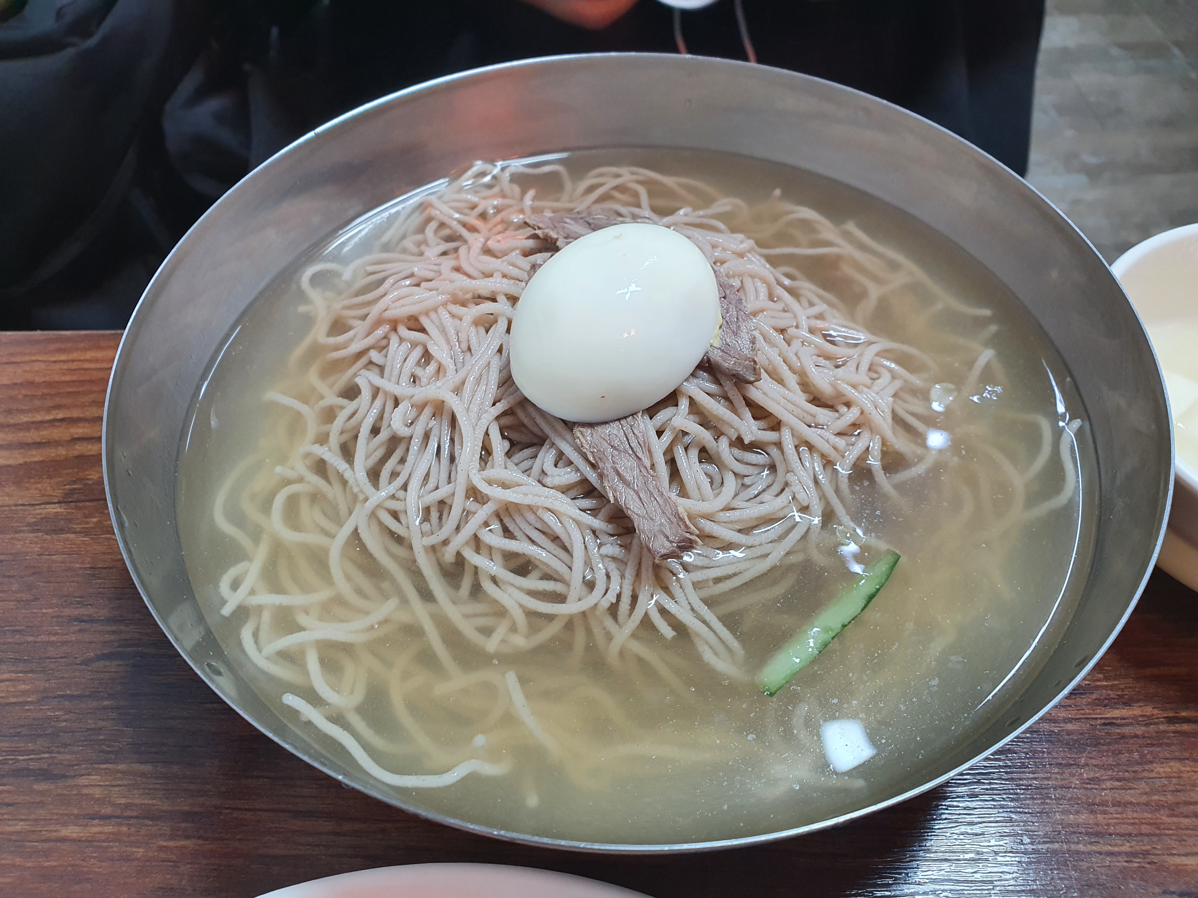 정인면옥 평양냉면의 물냉면은 위에 사진과 같이 나옵니다. 함흥냉면과는 확실하게 다른 느낌이죠잉? 국물이 시원하면서 슴슴하니 맛있어요. 막 자극적인 맛이 아니고 은은하게 그리고 나중에 또 생각나는 이맛 ㅋㅋㅋㅋ 친구꺼 좀 뺏어(?) 먹었다요. 최근 이 친구를 만나면 이집만 가는 것 같아요 너무 맛있고 중독되는 이맛 ㅋㅋㅋ 한번 빠져보세요. 처음에 이게 뭐야 싶을 수 있는데 빠지면 헤어나오기 힘들다구요 ㅋㅋㅋㅋ