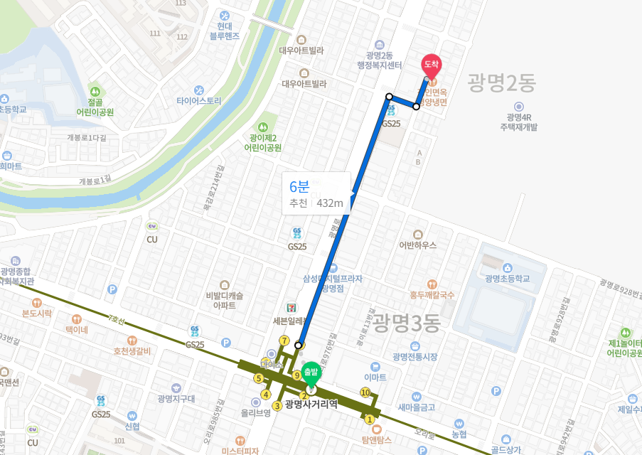 광명사거리역 맛집 정인면옥 평양냉면은 광명사거리역 8번 출구에서 걸어서 6분 정도 걸어가면 도착할 수 있는 거리입니다. 저는 개봉역에서 걸어서 갔드니 조금 걸리기 했어요. 버스 타면 덜 걸렸겠지만 걷는 걸 좋아해서 친구랑 걸어서 갔어요.