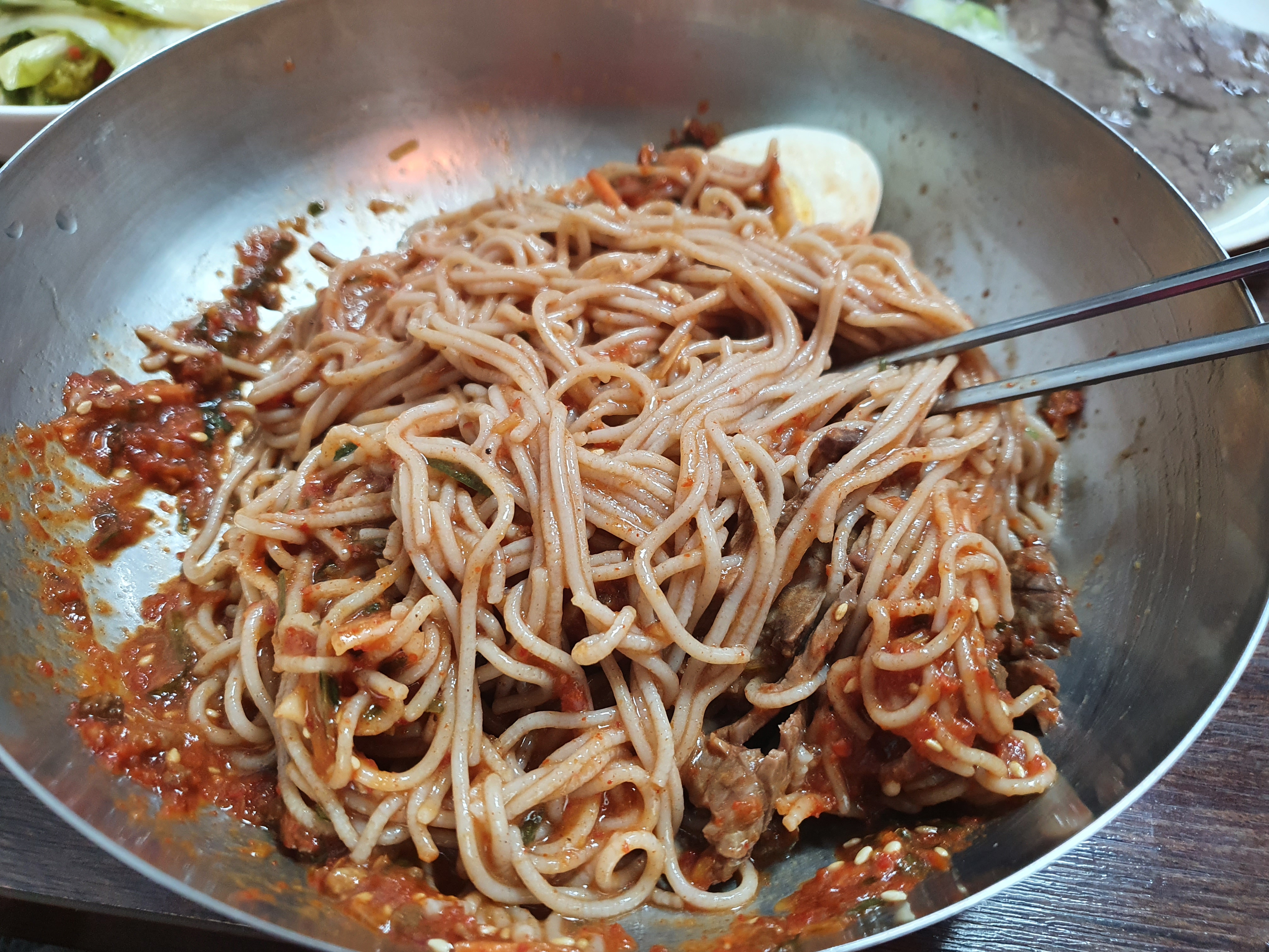 슥슥슥 젓가락으로 비비면 위에 사진과 같은데... 약간 양념이 적어보이지만 양념이 딱 정닥하게 잘 비벼져있는 것이랍니다. 아~ 한그릇 뚝딱 하고 싶어지네요. 앞에 나온 차돌박이 수육이랑 같이 먹으면 너무 맛있어요~~