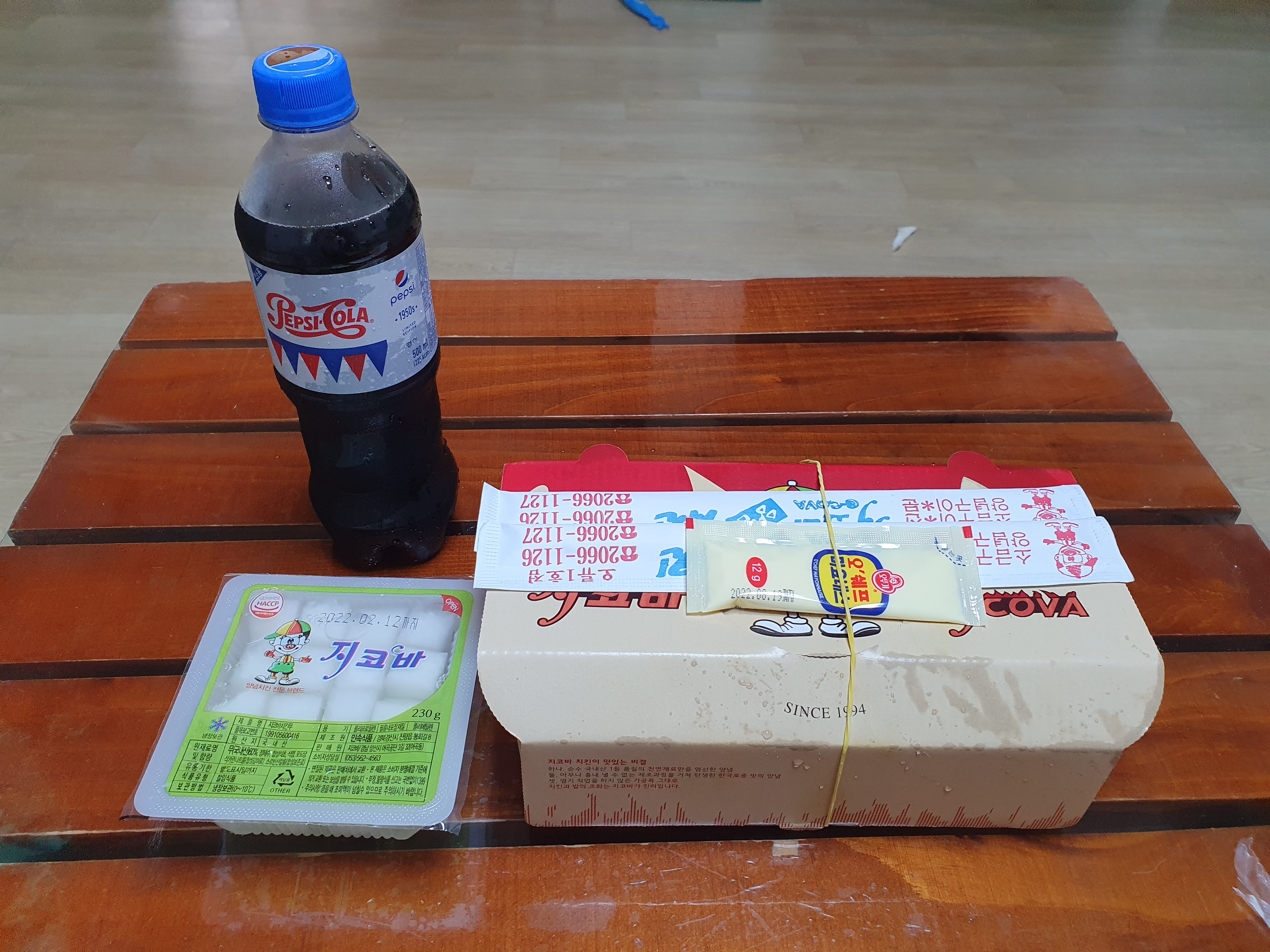 비닐봉지에서 꺼낸 구성은 콜라 500ml, 치킨무, 젓가락 2개, 마요네즈, 순살양념치킨 순한맛이었습니다.