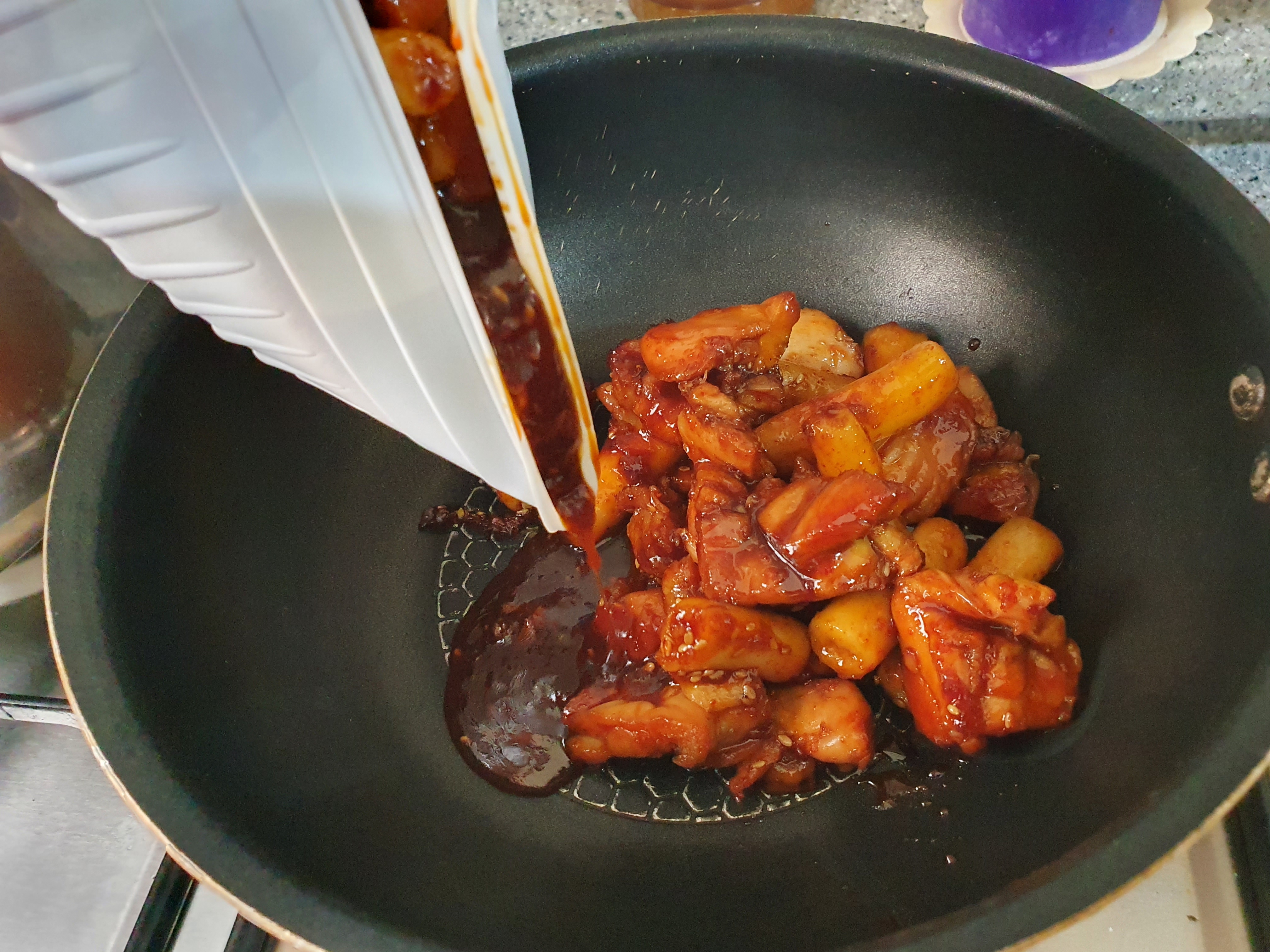 후라이팬에 일부 덜어내고, 순살양념치킨 순한맛이 담겨있던 용기를 위에 사진과 같이 잡고 양념을 부어 줍니다. 양념이 많이 들어가야 더 맛있어요~