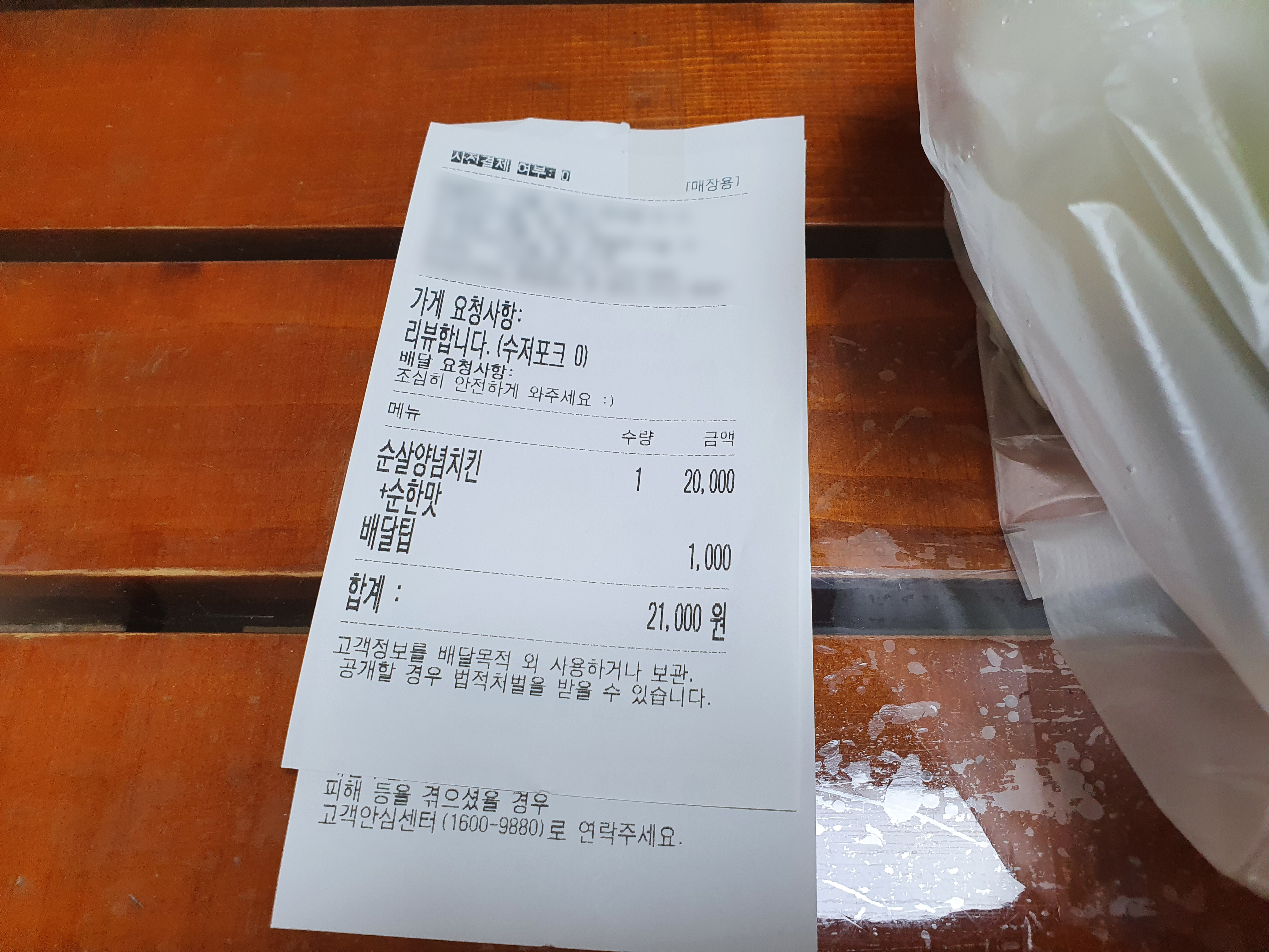 순살양념치킨 순한맛 20,000원 + 배달팁 1,000원 = 총금액 21,000원