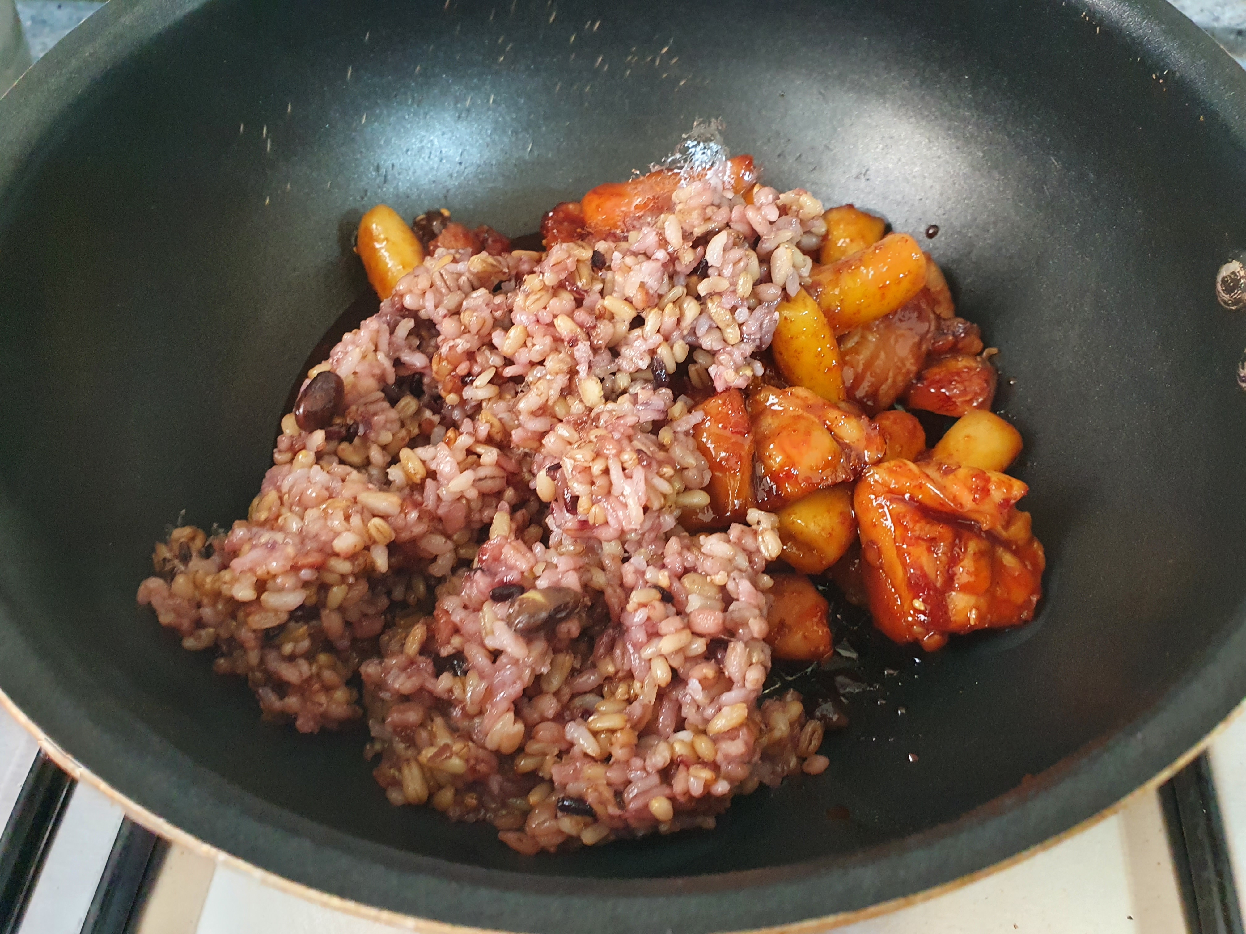 밥을 넣는데 너무 많이 넣으면 맛이 없을 수도 있어요. 한 공기 정도만 넣는 것은 추천합니다.