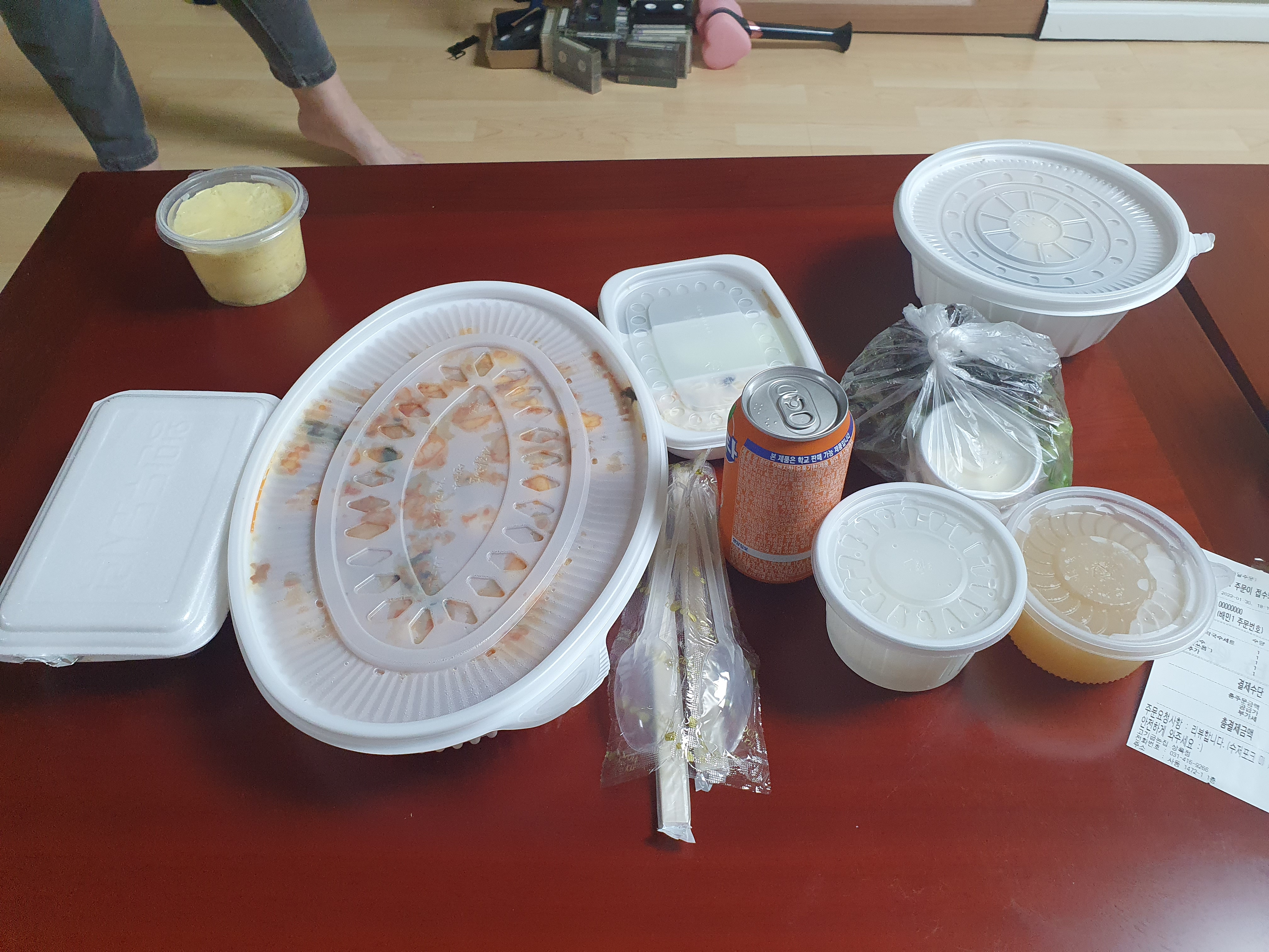 배달의민족에서 닭갈비를 검색해서 1960닭갈비를 찾았습니다. 1960닭갈비 막국수 세트를 선택했고 고기 1인분 추가 해서 결제를 했습니다. 대락 30분 정도 기다리니 주문한 음식이 도착했습니다. 포장된 음식을 상 위에 올려둔 것이 위에 사진입니다. 닭갈비, 쌈, 밑반찬, 계란찜, 환타, 막국수 등으로 구성되어있었습니다.