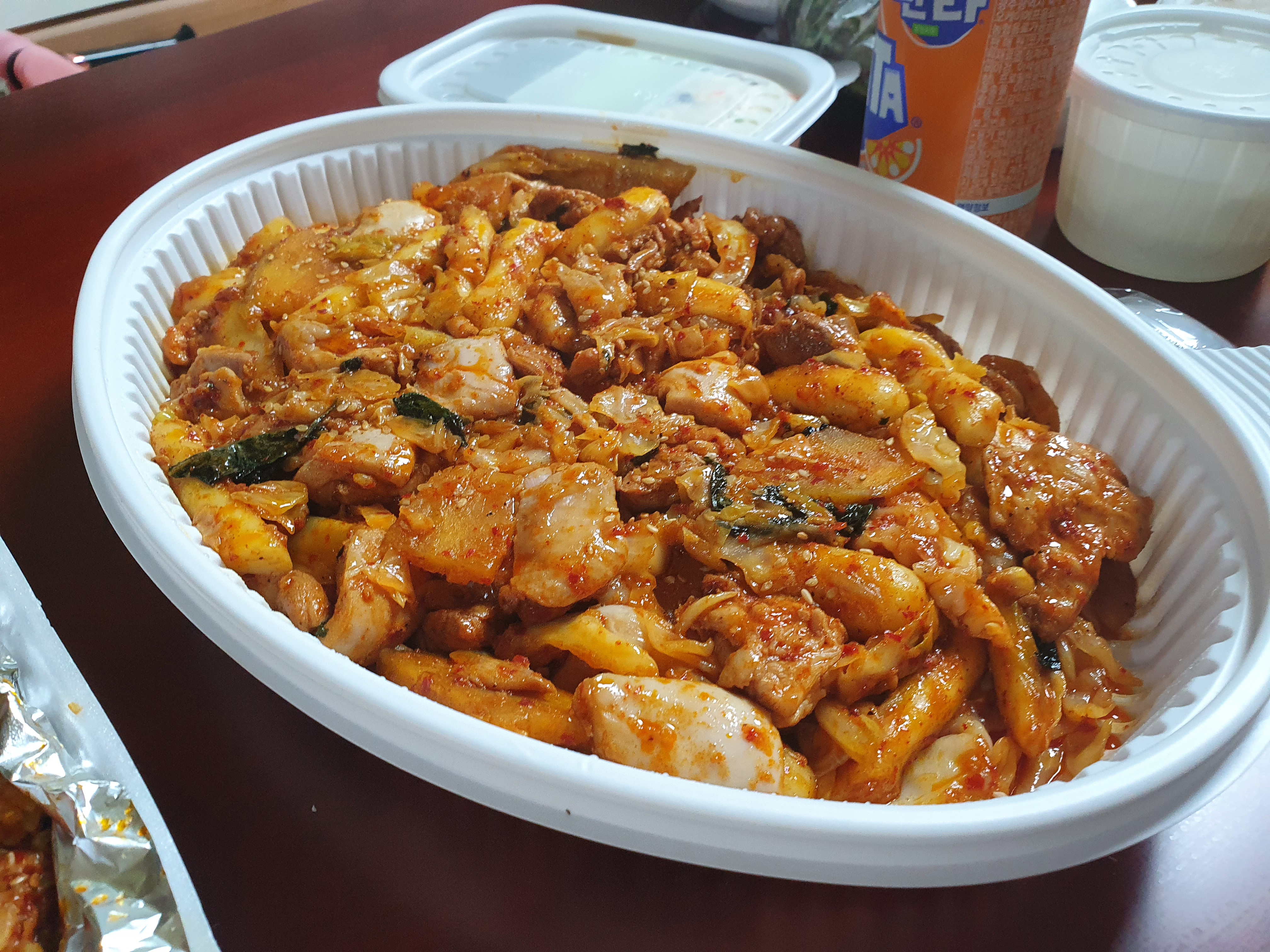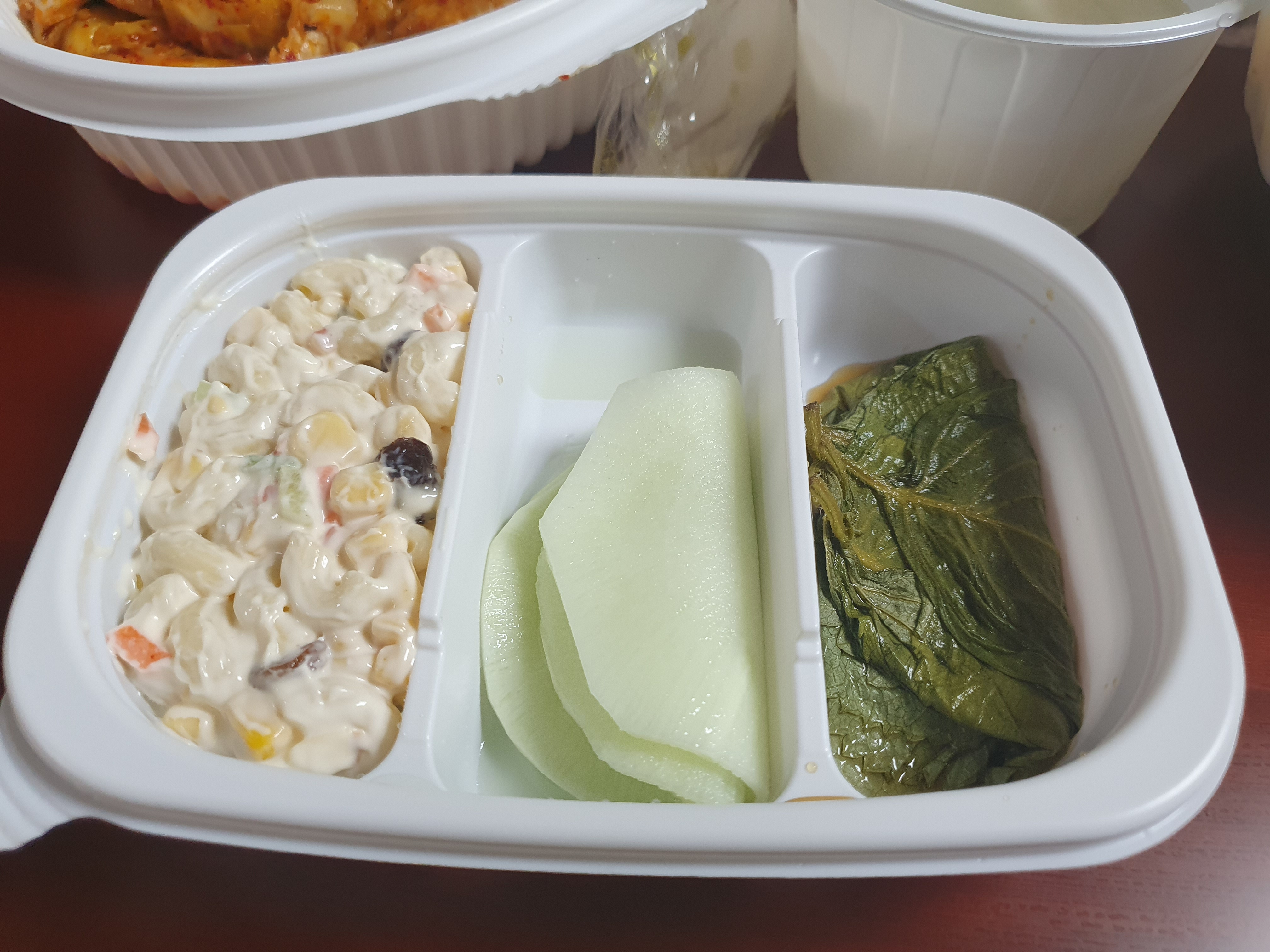 닭갈비가 야채들과 빨간 양념에 잘 익어 맛있었습니다. 개인적으로는 많이 맵지 않았어요. 집에 있는 밥과 같이 먹으니 더 맛있었고, 아래 사진으로 확인 할 수 있는 밑반찬, 막국수 등 같이 먹어도 맛있었습니다.