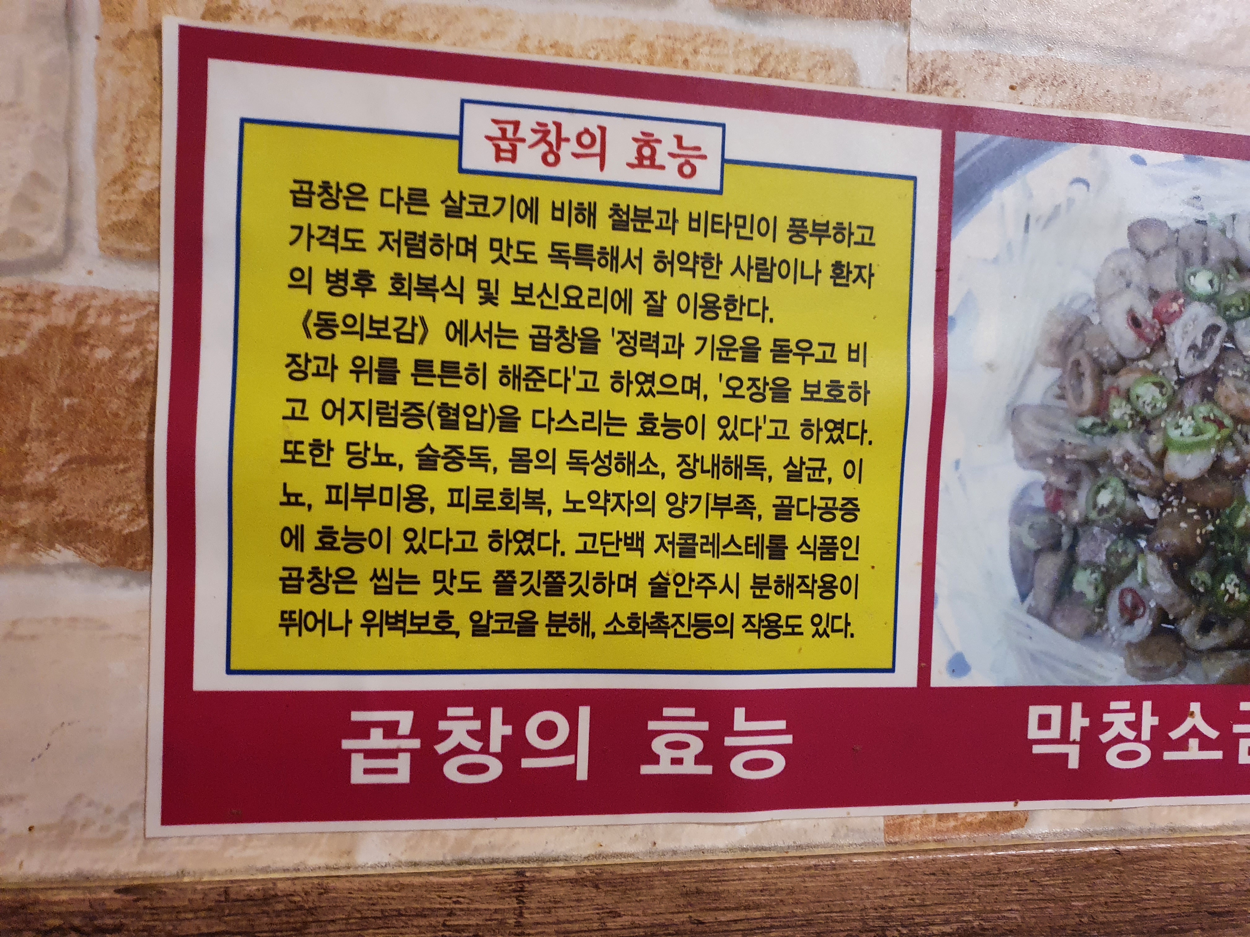 닭갈비 2인분이랑 공기밥 1개, 음료수(사이다) 1개를 주문했습니다. 그리고 곱창의 효능에 눈이가 대충 읽어 보았습니다. 정력과 기운을 돋우고 비장과 위를 튼튼하게 해준다고하네요.