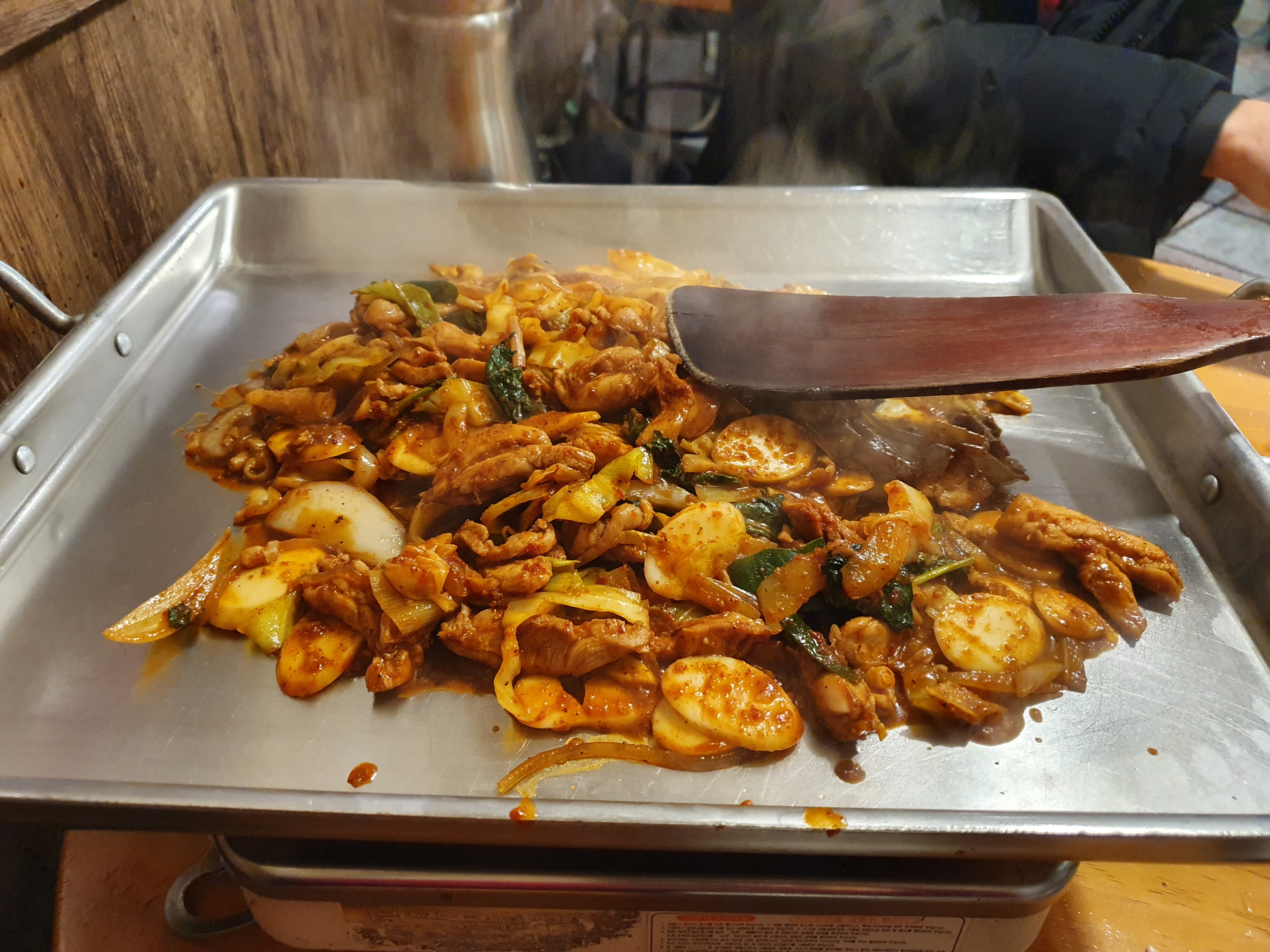 닭갈비 2인분이 다 익어서 나왔습니다. 직원분이 철판에 올려서 가지고 오셨고 약불로 불을 키고 먹어도 됩니다~ 하고 가셨습니다.