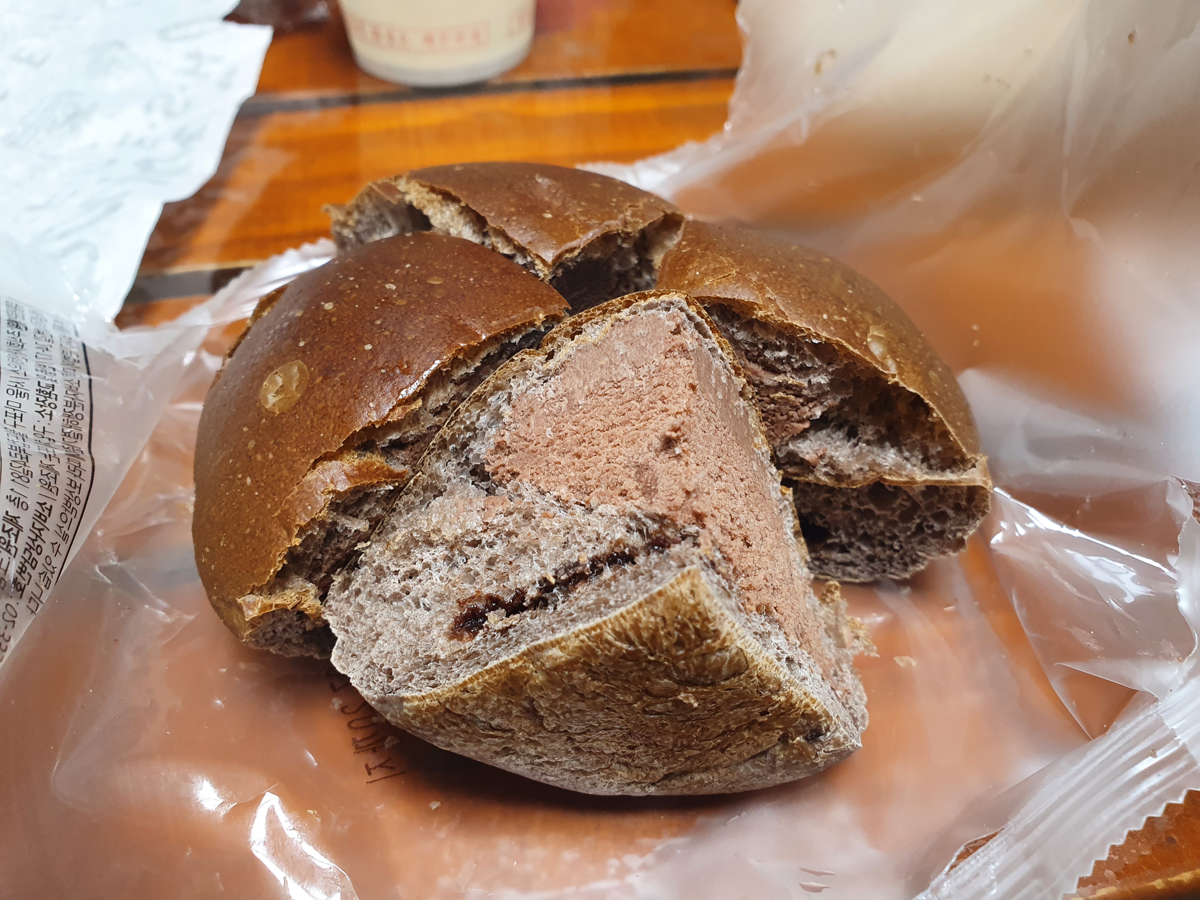 이것도 4등분을 했는데요. 크림바바초코는 안에 초코그림이 있는데 얼어 있어서 그런지 빵 속에 아이스크림이 들어간 느낌이었습니다. 입에서 살살 녹는데 앞에 춘천감자빵이랑 비교하면 조금 들 맛있었어요. 그래도 맛있었다구요~