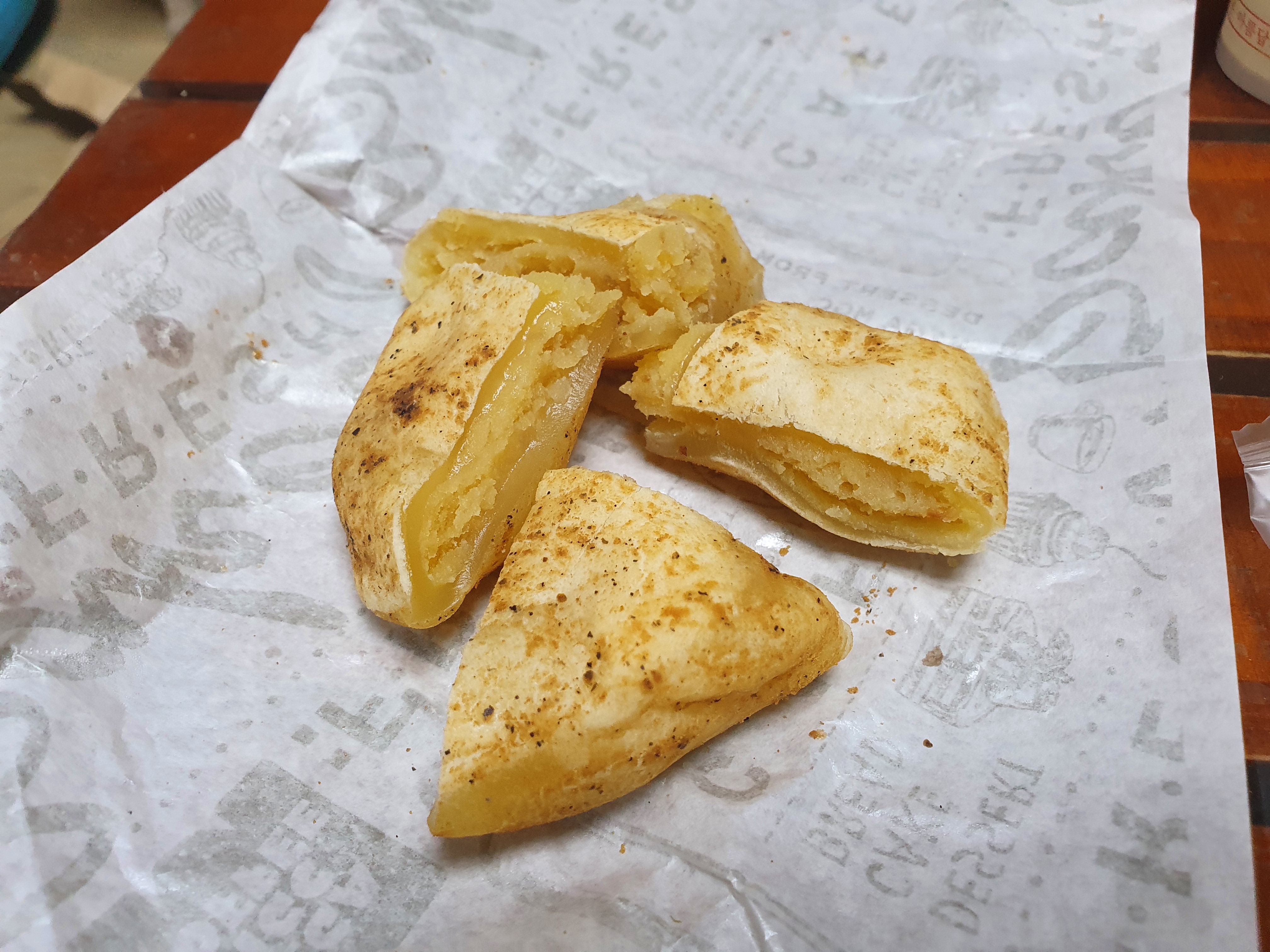 가위로 대충 4등분 해서 포크로 집어 한입에 먹을 수 있게 했습니다. 따뜻할 때 먹으니 좋네요. 겉은 쫀득 속은 감자!ㅋㅋㅋㅋ 뒤에 소개 할 빵보다 개인적으로 맛있었어요.