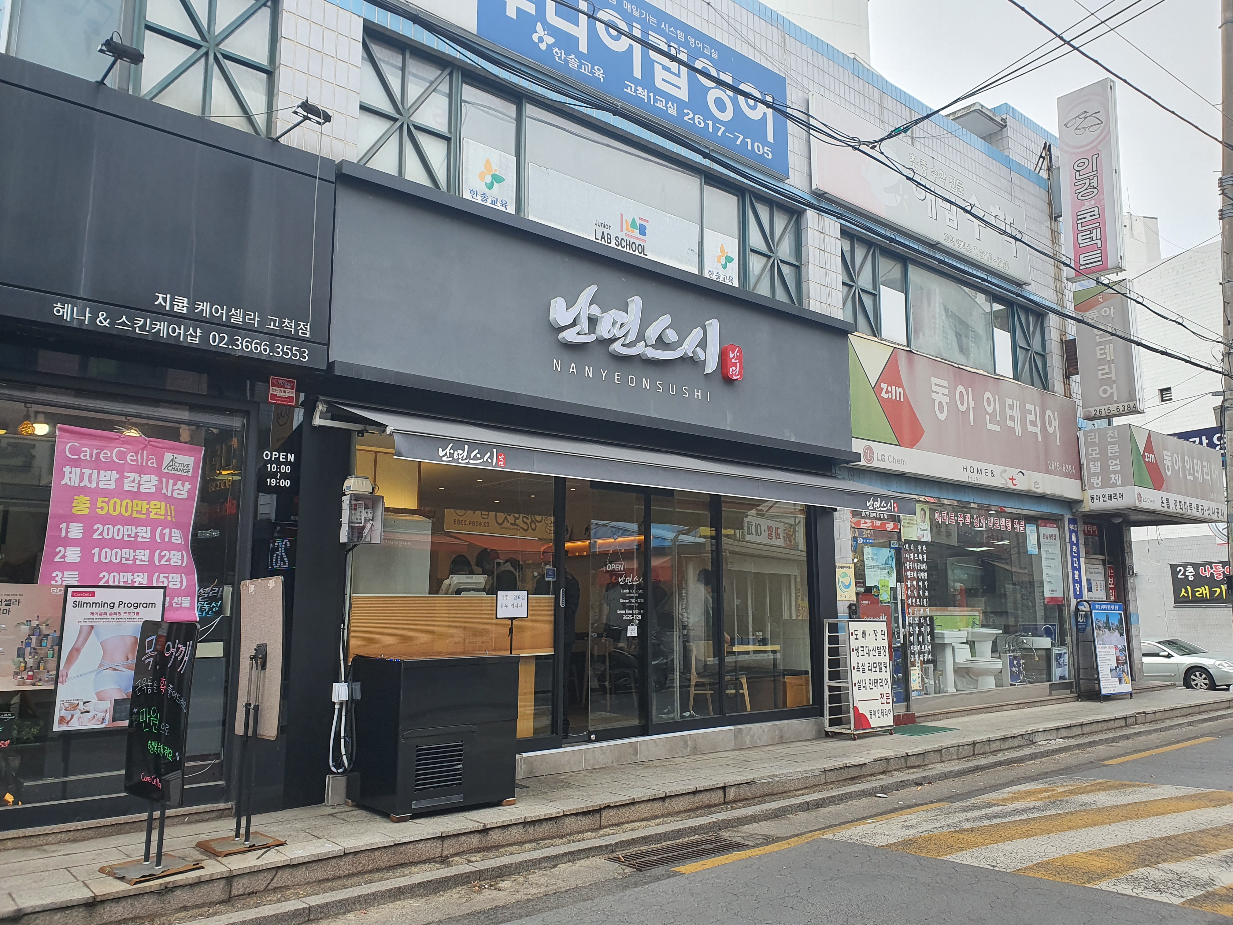 운 좋게 주차공간이 하나 있어서 주차를 하고 난연스시에 들어갔습니다. 들어가기 전 난연스시 앞에서 찍은 사진입니다.