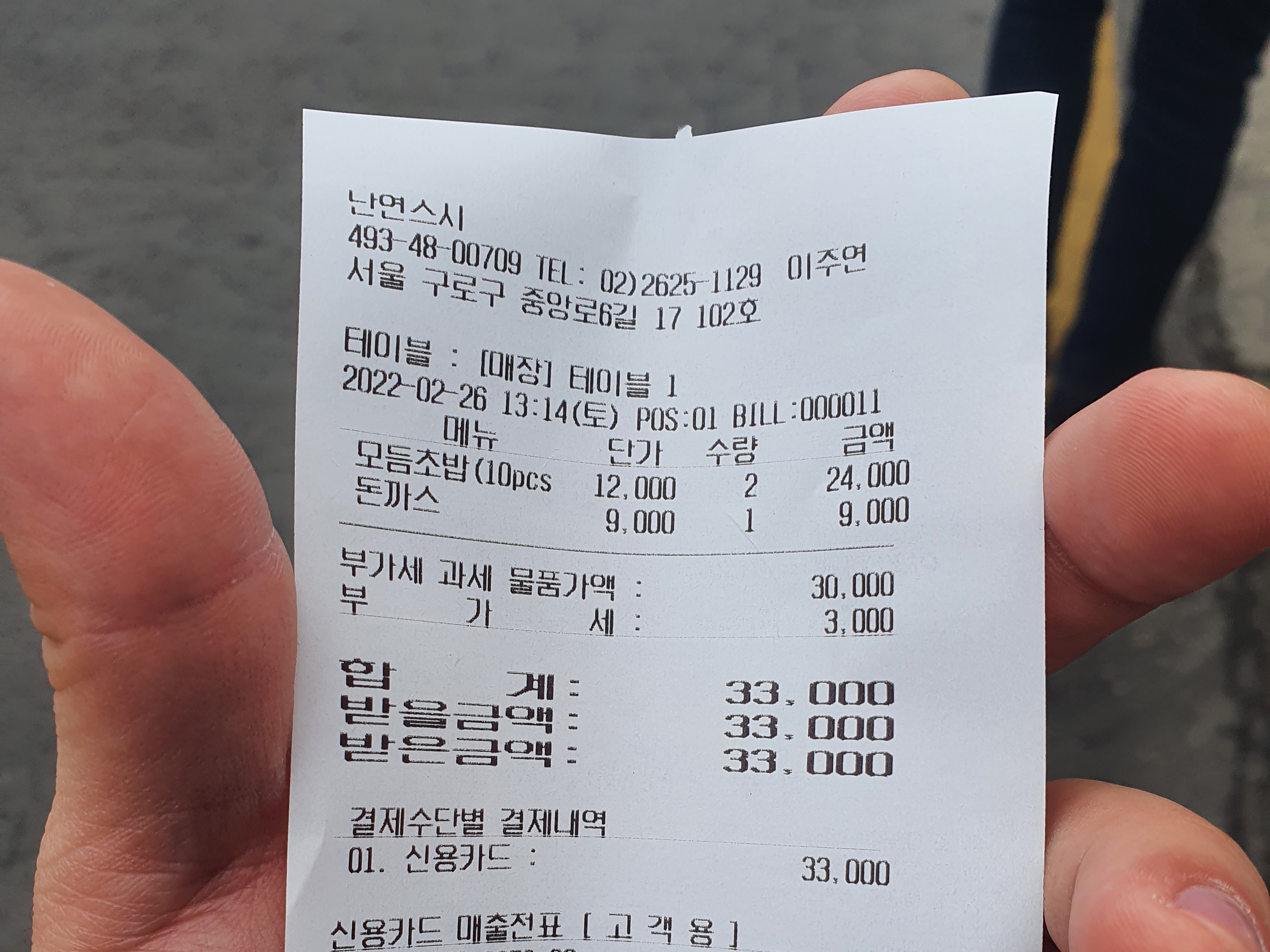 (모듬초밥 12,000원 x 2개) + (돈까스 9,000원 x 1개) = 총금액은 33,000원