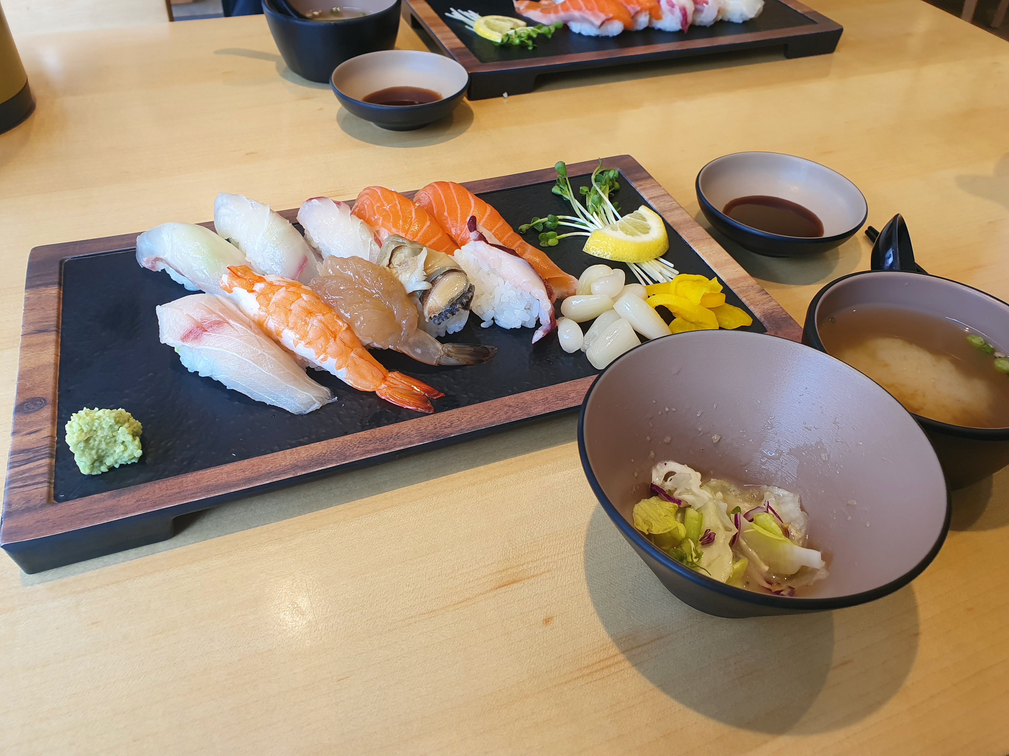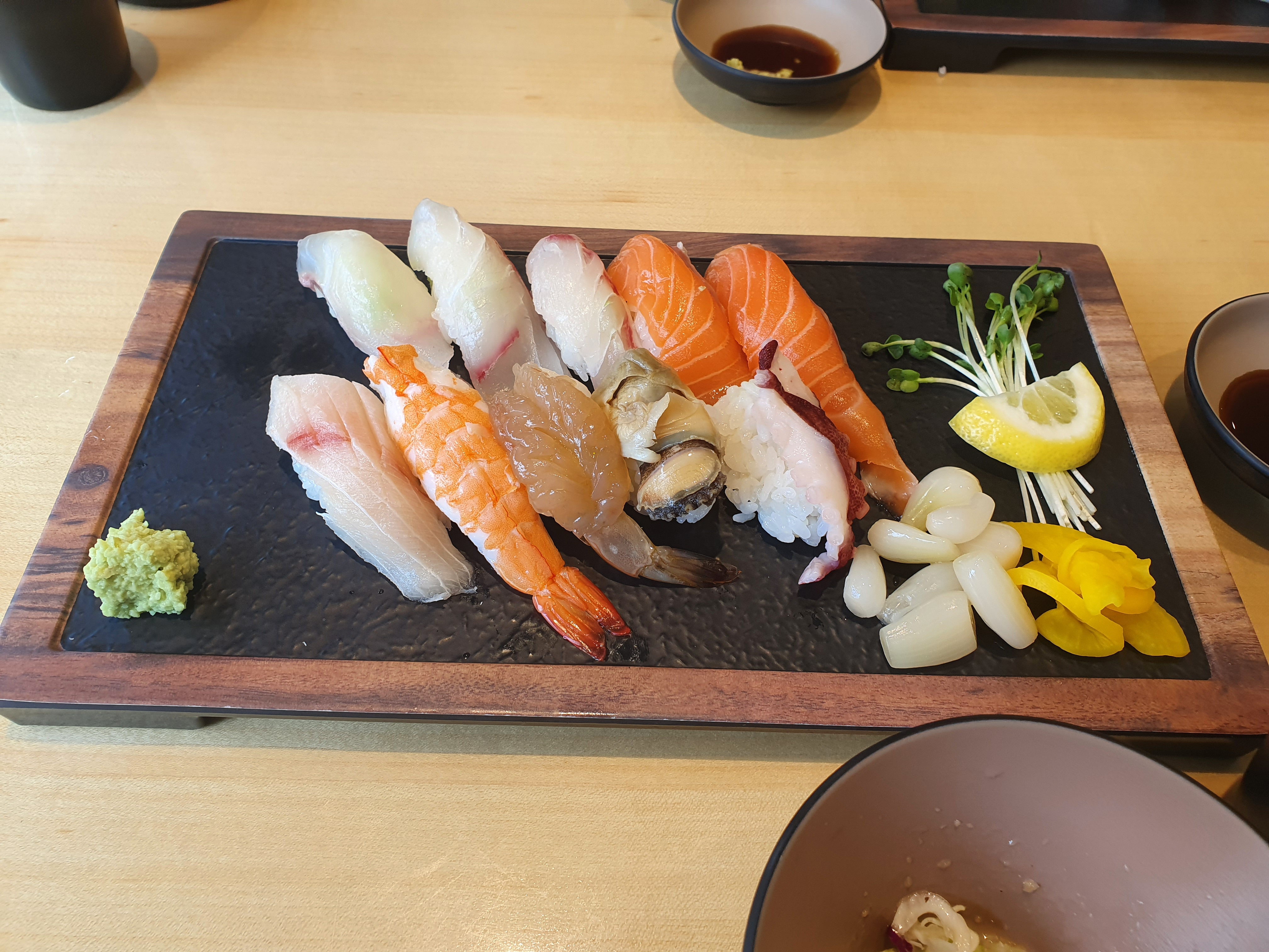 모듬초밥이 먼저 나왔습니다. 위에 사진을 보면 10가지 초밥이 나란히 놓여있었고 한쪽에는 무싹과 레몬, 한쪽에는 생와사비가 위치하고 있었습니다. 쪽파 대가리 처럼 생긴 락교와 노오란 단무지는 제가 옆 비치되어 있는 통에서 꺼내 떨어 놓은 것입니다.