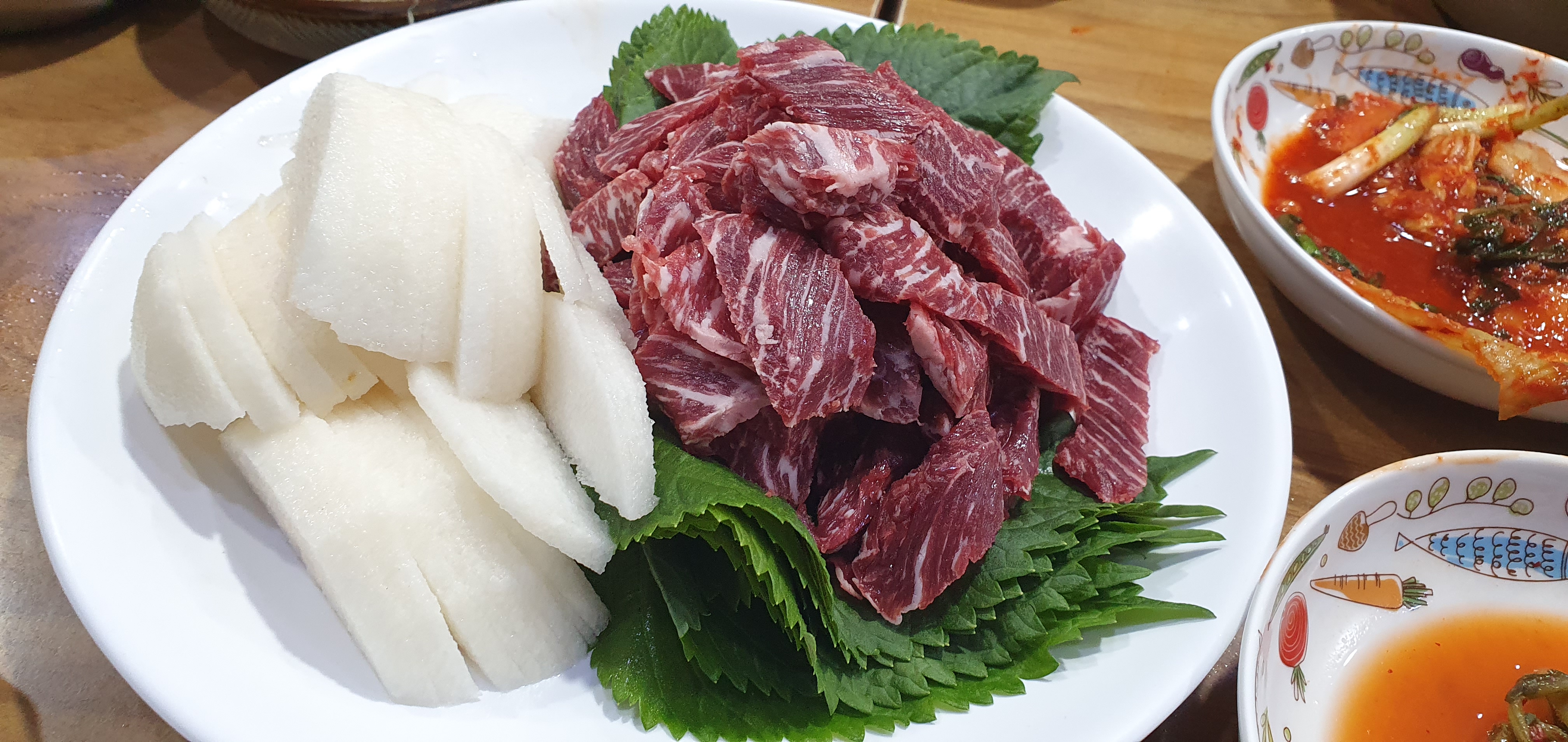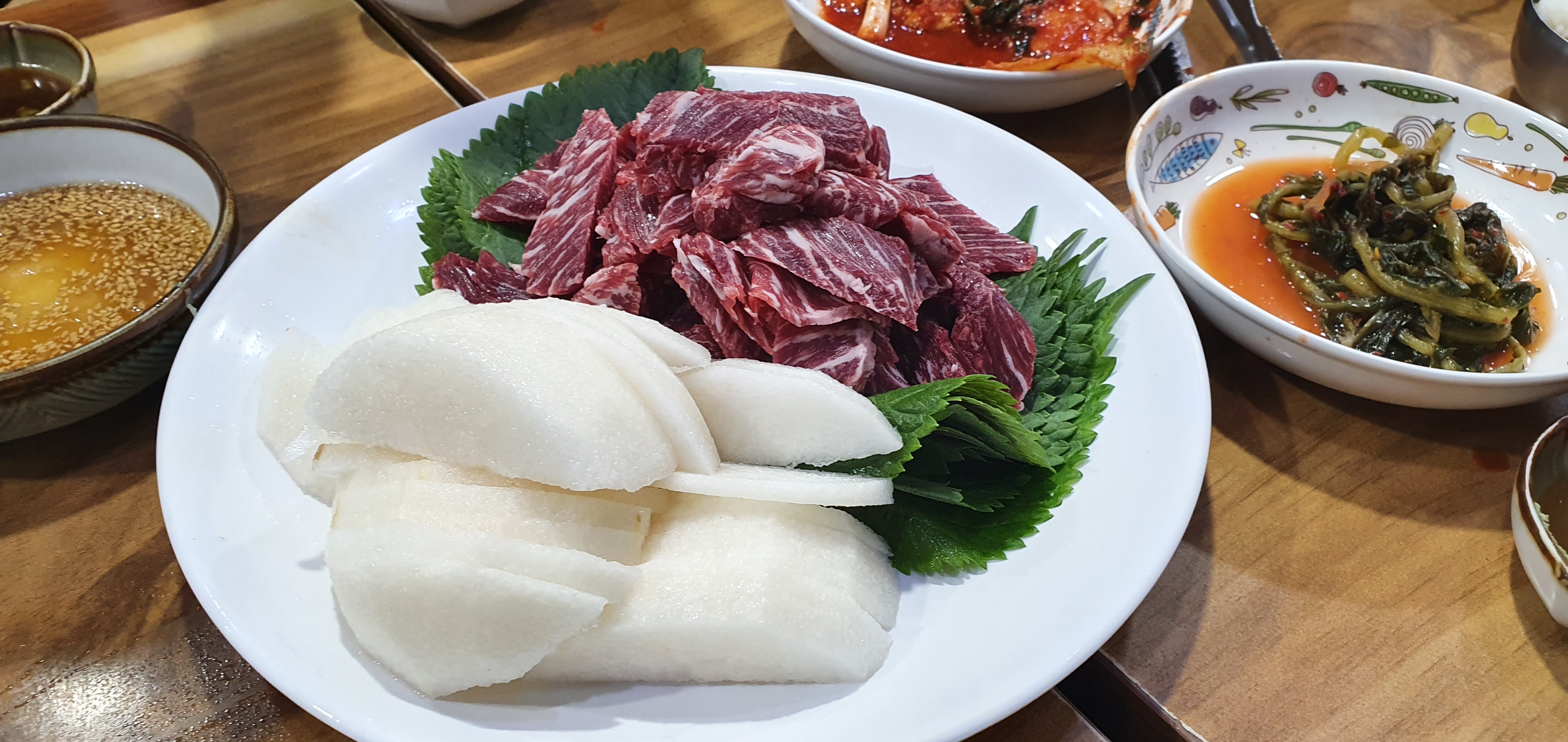 처음에 육사시미(한우 사시미)만 한 입 했는데 입 안에서 살살 녹네요 ㅋㅋㅋㅋ 그리고 배와 육사시미(한우 사시미)를 같이 기름장에 찍어 먹었는데 배의 달달함과 기름장에 쌉쌉하며 고소한 맛이 어우러져서 진짜 너무 맛있드라구요. 중간중간 빨간 장을 먹었는데 개인적으로는 기름장이 더 맛있었습니다. 같이 간 친구 중 한명은 깻잎을 싸먹어도 맛있다고 하더라구요.. 개인적으로는 깻잎 향이 진해 고기맛이 감춰지는 것 같이 빼고 먹었답니다.