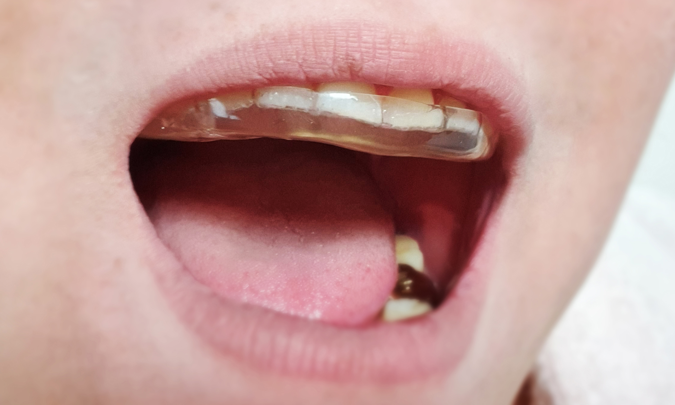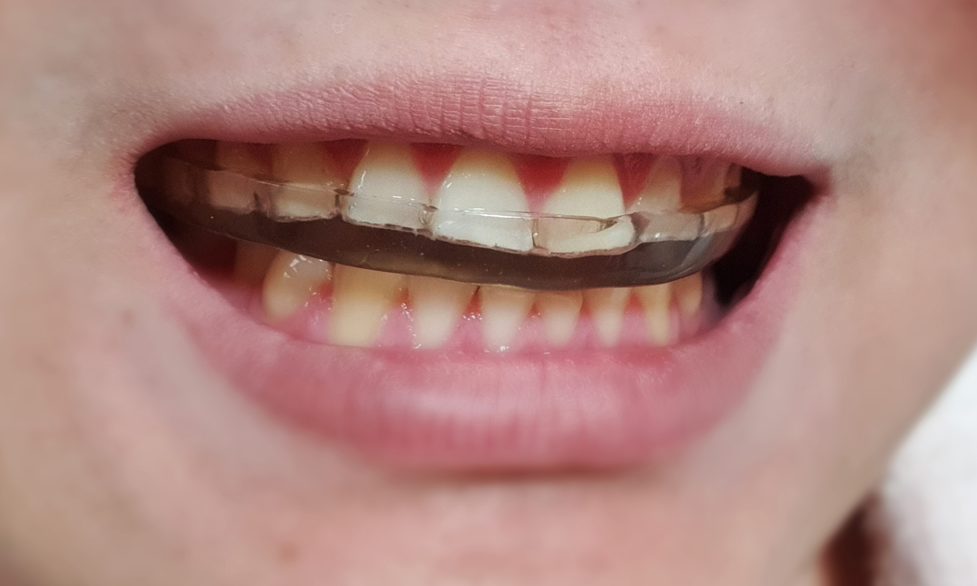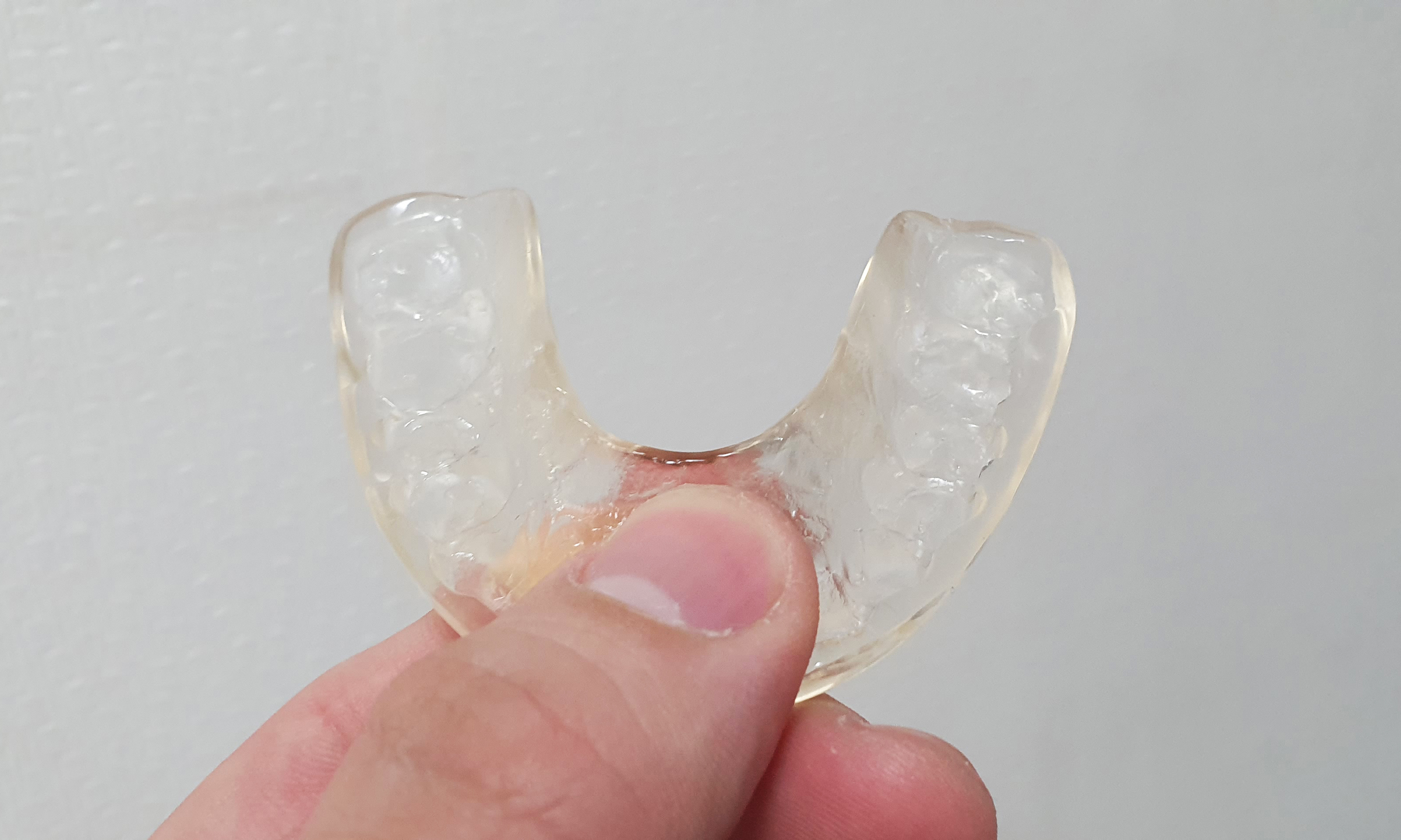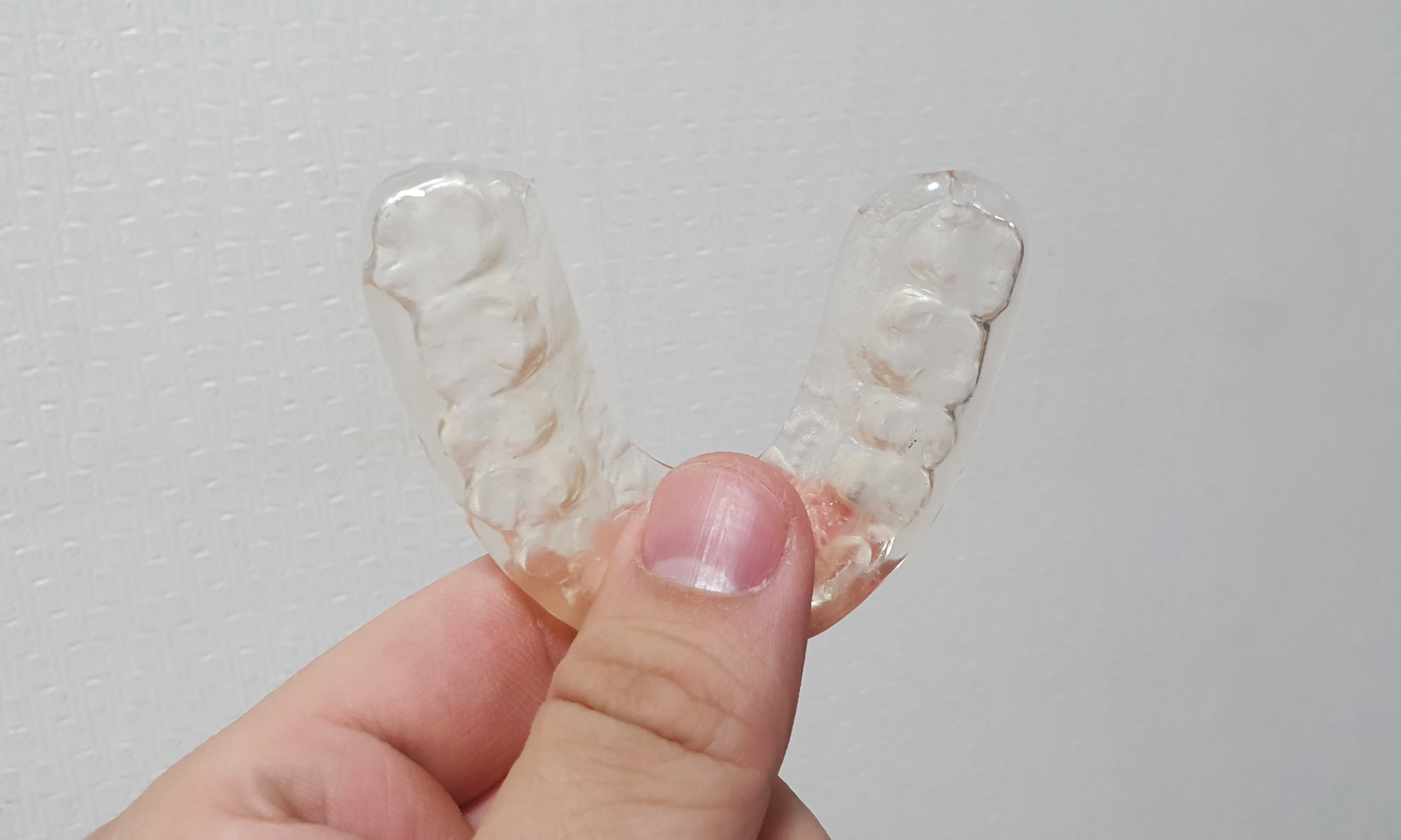"이갈이 보호 마우스피스의 일부가 이빨에서 약간 떠서 있어 시소처럼 오르락내리락해요."