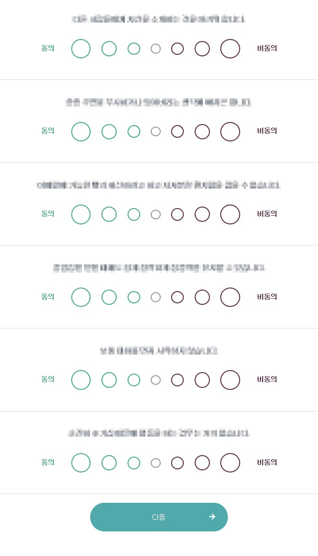 문항을 너무 파고들거나 결과를 계산하고 답하기보다는 동의 또는 비동의에서 조금이라도 더 마음에 가는 쪽을 정도에 따라 바로바로 답하시면 될 것 같습니다.