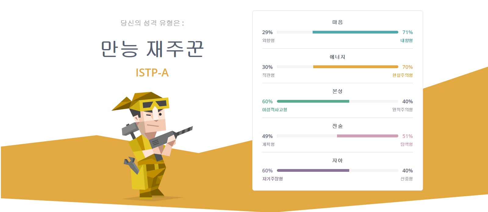 성격 유형(ex. ISTP), 성격 유형의 별칭(ex. 만능 재주꾼), 성격 유형이 나온 이유에 대한 항목(마음, 에너지, 본성, 전술, 자아)의 퍼센트를 확인할 수 있습니다. 그리고 페이지를 내려보면 자세한 설명이 있으니 확인해보세요~