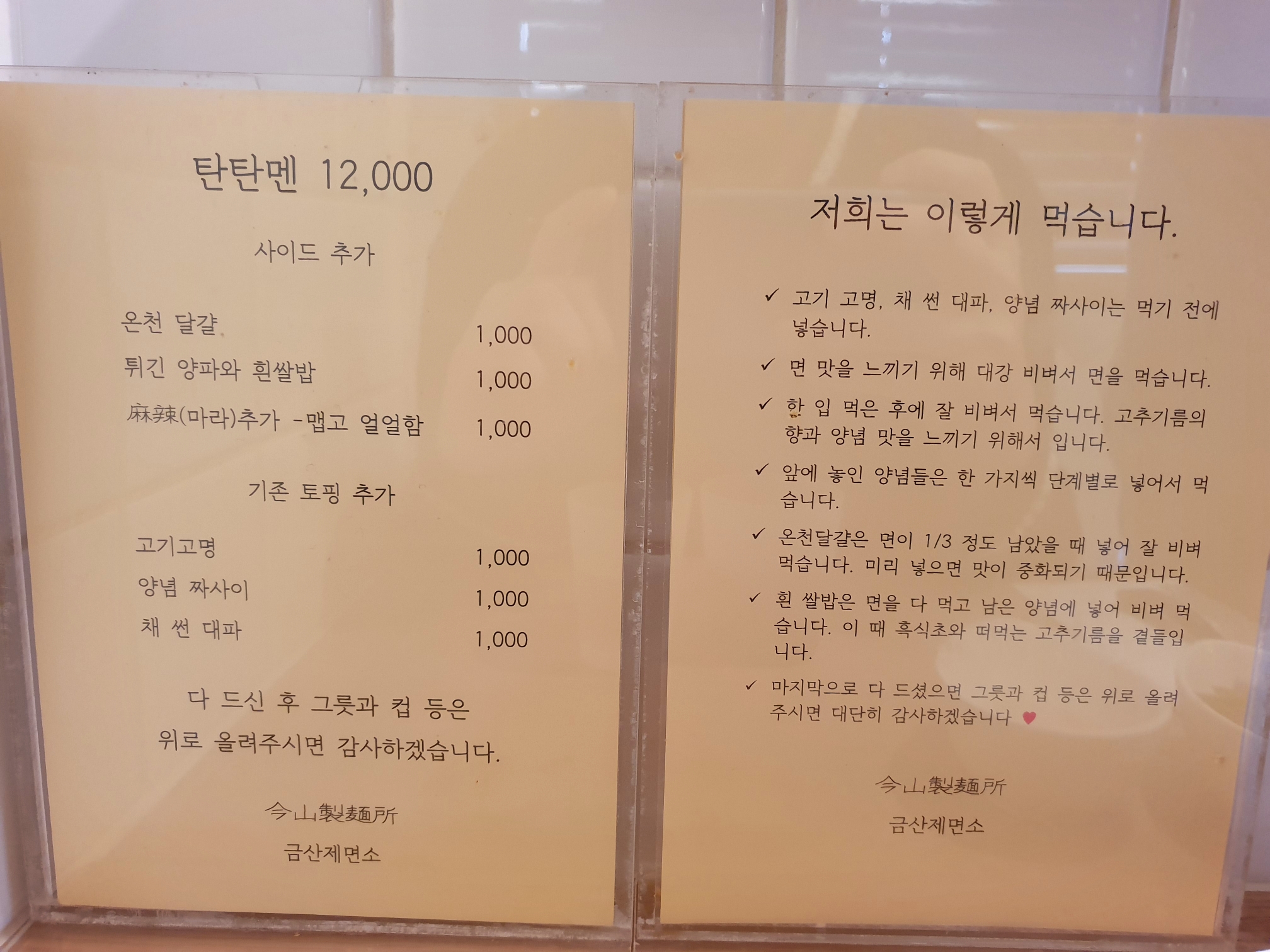 금산제면소는 오전 11시 개점 오후 8시 폐점이고, 오후 2시 45분 마지막 주문을 받고 오후 4시까지 준비시간(브레이크 타임)이 있었습니다. 단, 주말과 공휴일은 휴식 시간 없다네요~ 그리고 연중무휴지만 명절은 휴무!!!