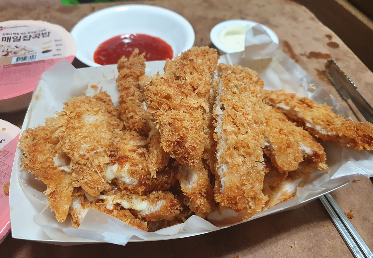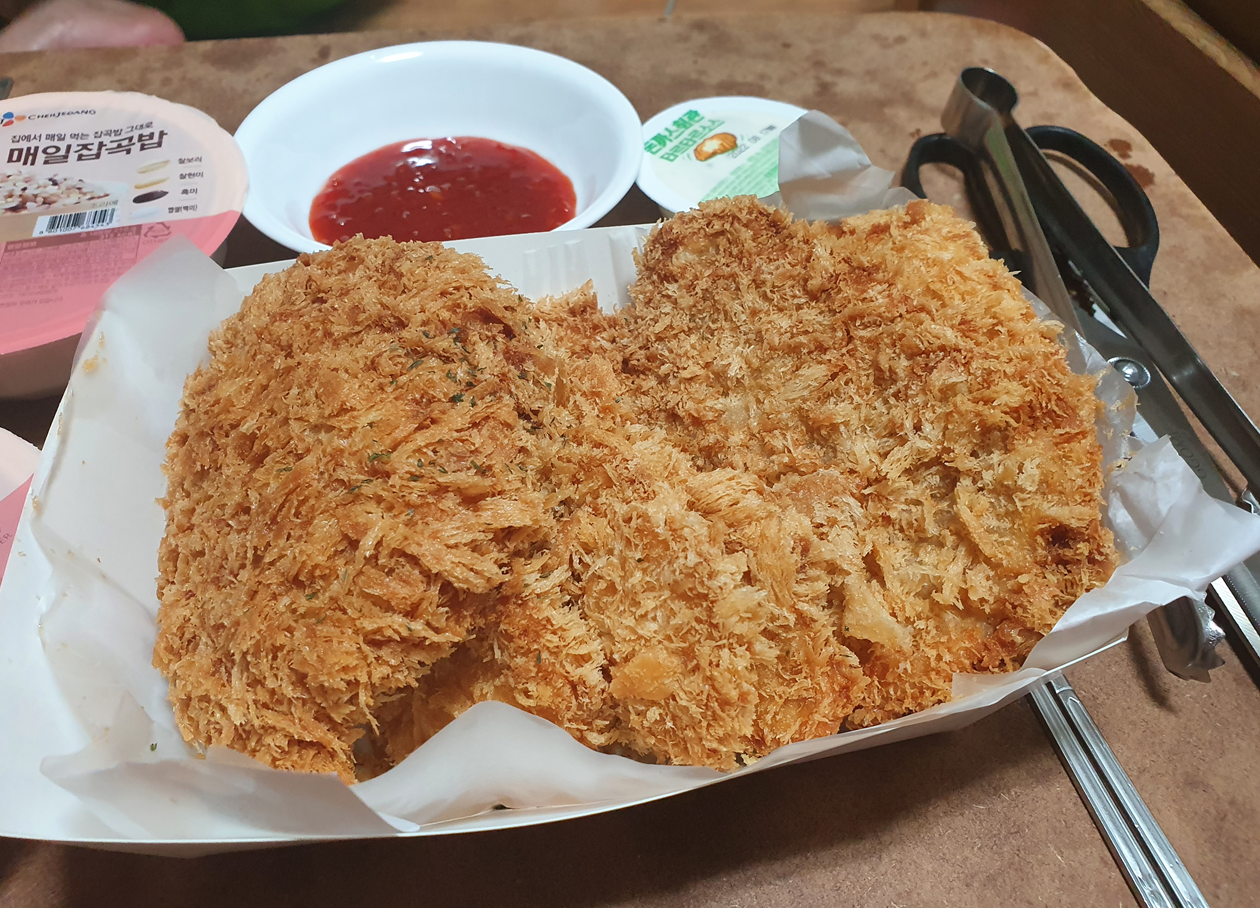 집에 치킨 양념소스가 있어서 그릇에 덜었고, 햇반을 전자레인지에 돌려서 가지고 왔습니다. 위에서 사진은 돈까스를 자르기 전 사진입니다. 튀김옷이 바삭바삭 소리를 내는 것 보니 너무 좋드라구요.