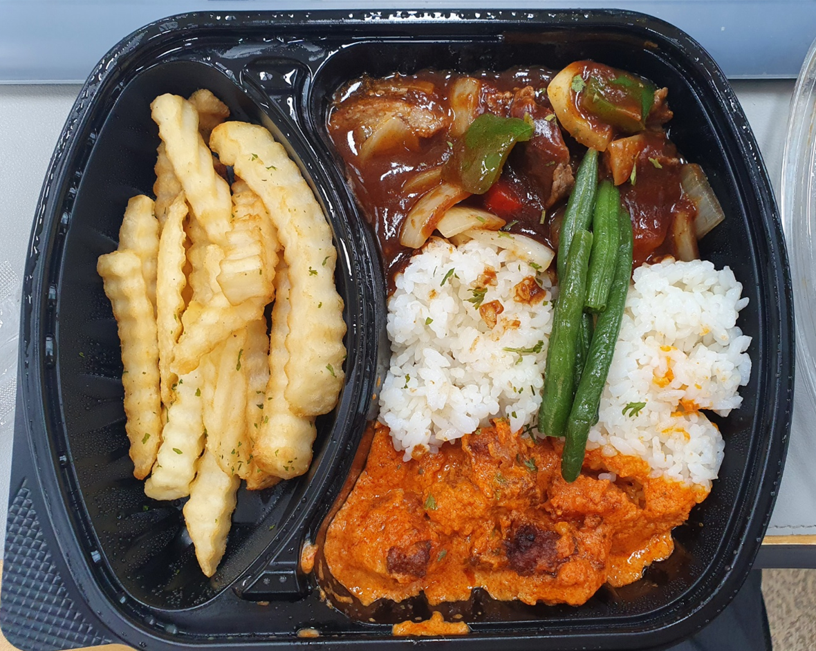 위에 사진은 그날 먹은 도시락의 사진입니다. 구성은 감자튀김, 스테이크, 커리ㅋㅋㅋ 감자튀김 대신 샐러드로 변경이 가능한 것 같았습니다. 바로 먹을 때는 샐러드도 좋지만 잠깐 뒀다가 먹기에는 감자튀김을 추천합니다. 그 이유는 옆에 음식을 뜨거워서 샐러드 숨이 죽는 것 같았습니다.