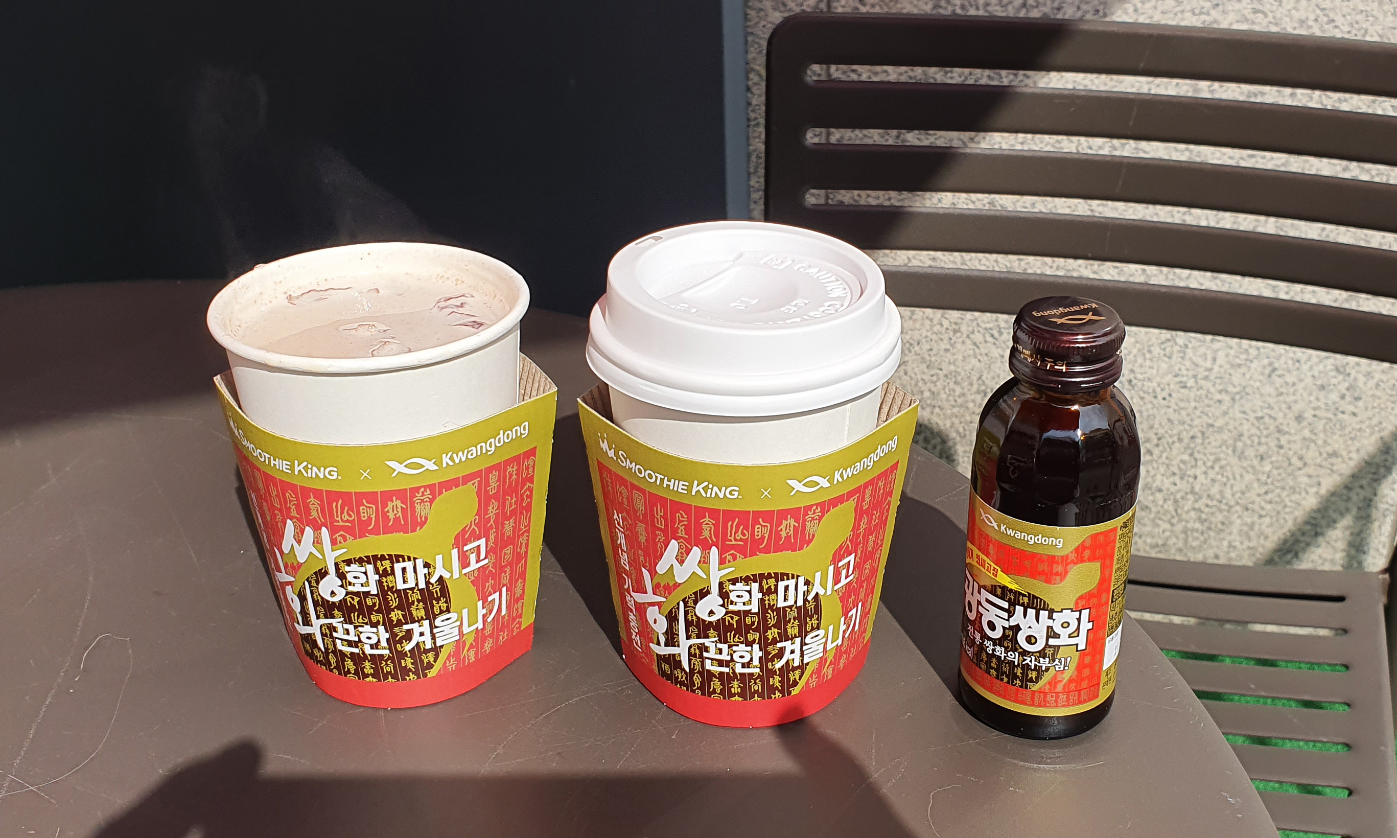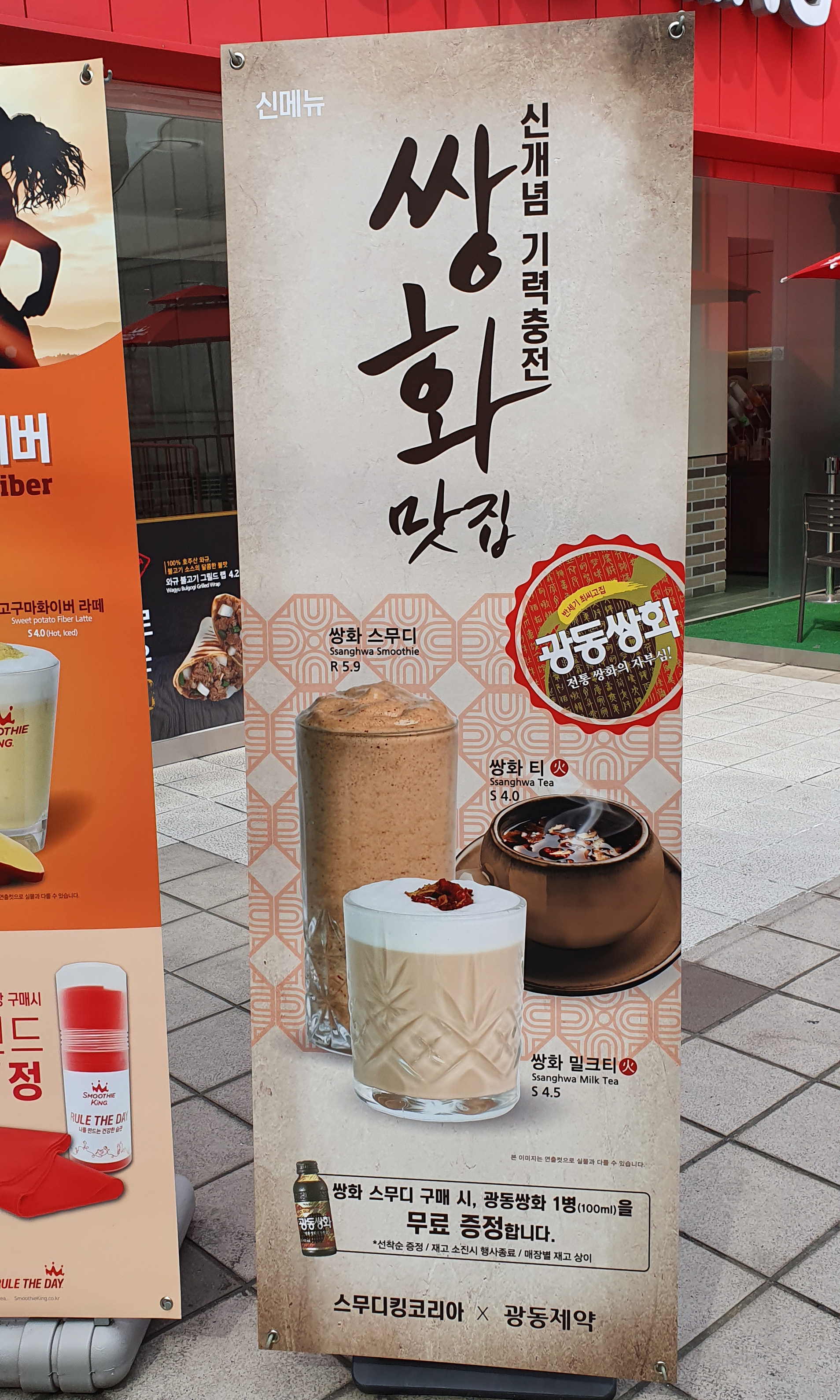 스무디킹코리아 x 광동제약 신메뉴 관련 엑스배너로 쌍화스무디, 쌍화티, 쌍화밀크티 이렇게 세 가지였습니다. 그리고 쌍화스무디 구매 시, 광동쌍화 1병을 무료로 증정한다고 하네요. 스무디킹이랑 조금 안 어울리는 조합으로 보이지만 개인적으로 쌍화탕을 좋아하고 호기심에 일단 마셔보기로 했습니다.