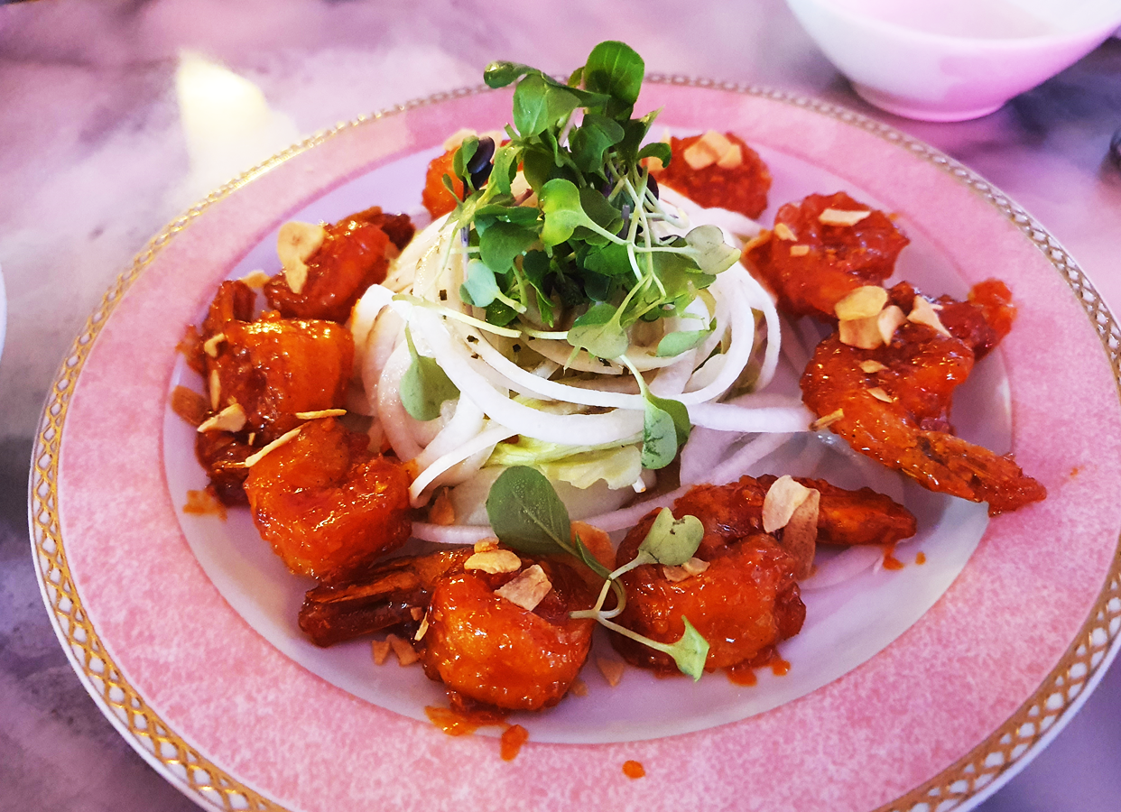 메뉴판에서 이름과 메뉴 설명을 보았을 때 집작이 안 되었었는데 이렇게 만나니 맛이 더 궁금했습니다. 칠리새우와 야채가 함께 있는 메뉴였습니다. 새우튀김이 달콤 맵콤한 양념을 입고 있었고, 가운데에 있는 야채와 먹으니 맛있었습니다.