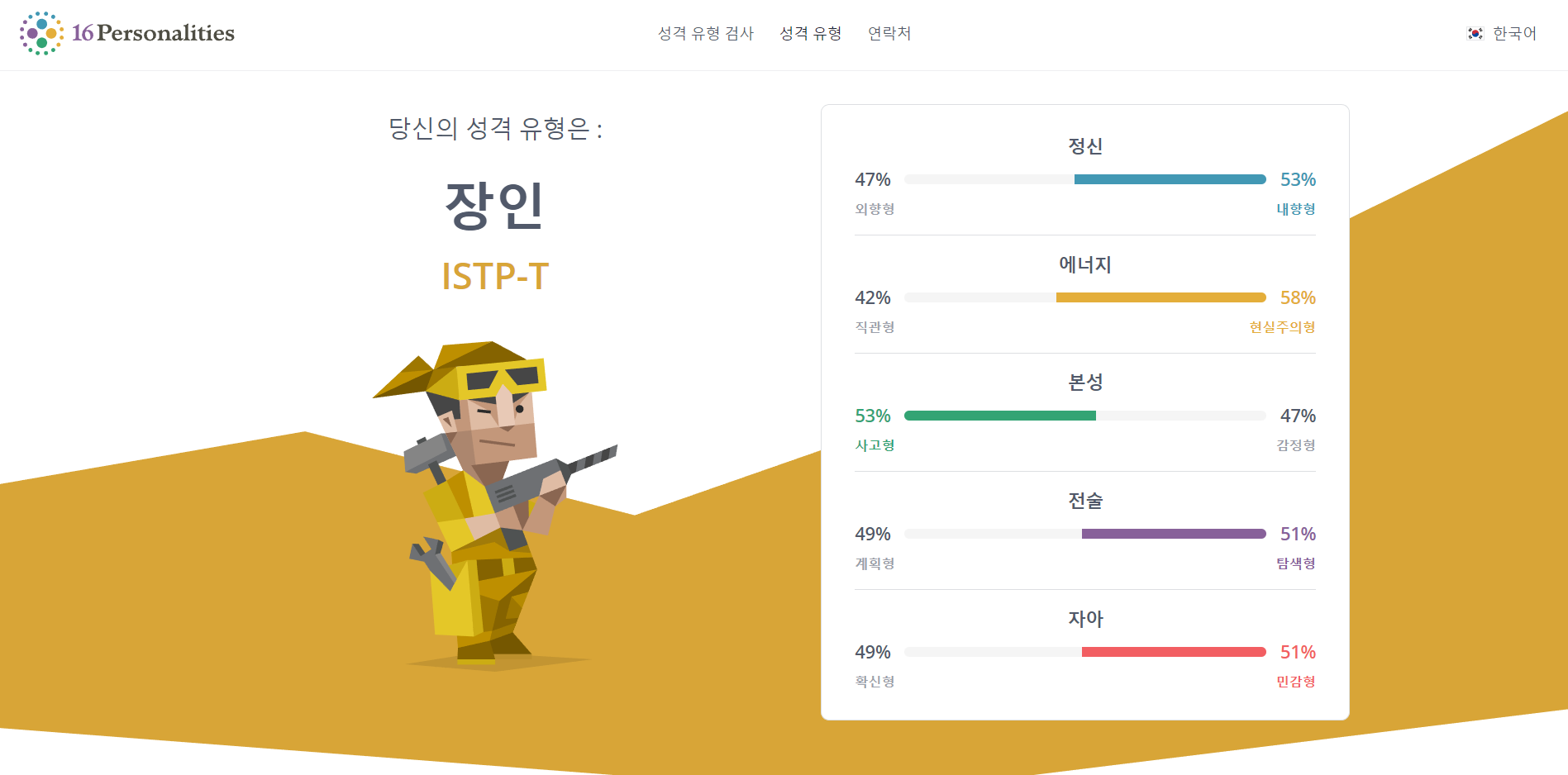 이번에 한 결과는 ENTJ입니다. 개인적으로는 조금씩 변동이 있더라구요 ㅋㅋㅋ 다른 성격유형은 어떤 특징이 있는지도 확인 가능합니다.