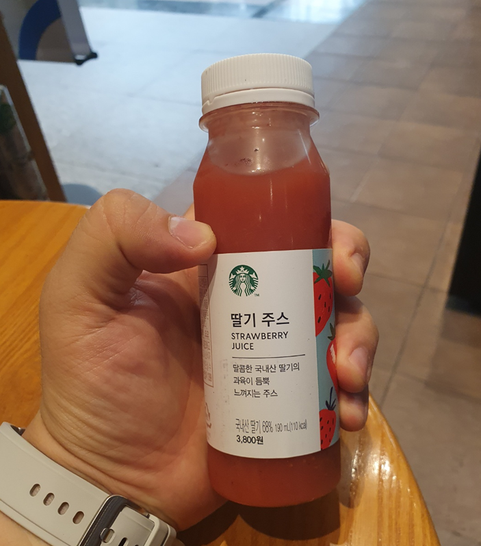 딸기 주스는 위에 사진과 같이 즉석에서 만들어 주는 메뉴가 아니어서 금방 받아 올 수 있었습니다. 딸기주스는 달콤한 국내산 딸기의 과육이 듬뿍 느껴지는 주스라고 적혀있네요 ㅋㅋㅋㅋ 국내산 딸기 68% 가격은 3,800원!ㅋㅋㅋ 괜히 스타벅스 로고 박혀있으면 있어 보이는 그런 거 있잖아요? 그냥 딸기 주스입니다~