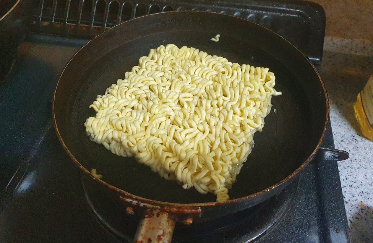 1. 작은 후라이펜에 물을 담고 라면 면을 넣고 끓입니다.