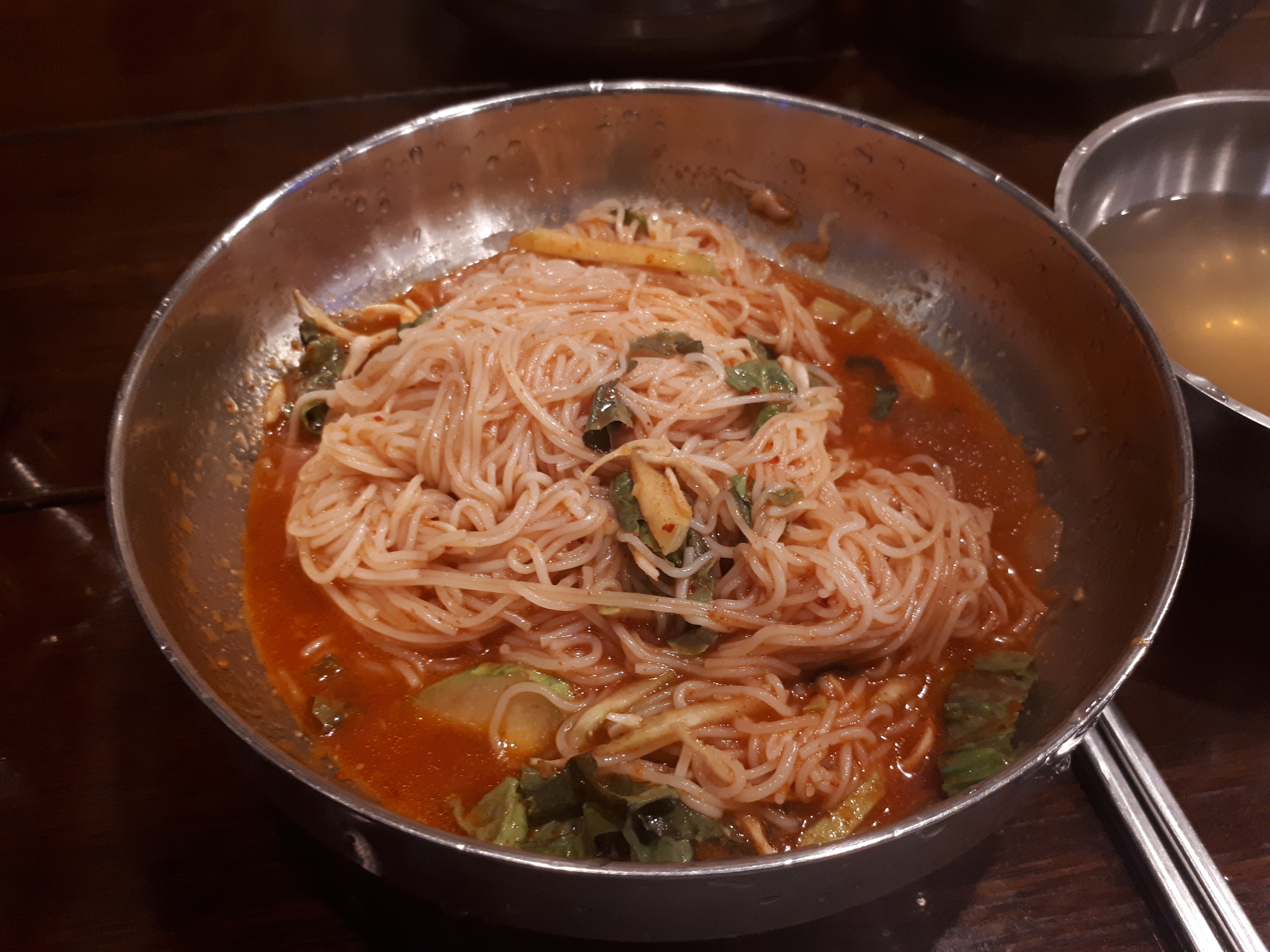비빔국수는 위에 사진과 같이 나왔습니다. 국물이 있는 비빔국수였고, 위에 올라간 양배추가 빨간 국물에 대비되어 더 먹음직스러운 느낌을 주는 것 같았습니다.