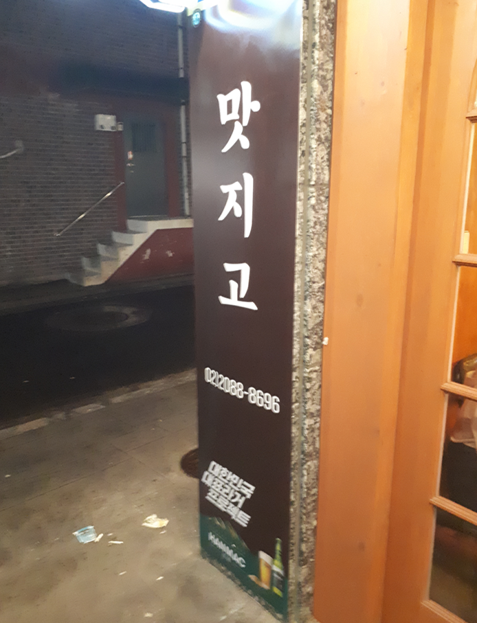 맛지고의 외관 사진은 찍지 않았습니다. 사이드 간판은 사진을 찍었는데 상호명과 전화번호를 확인할 수 있었습니다. 전화번호는 02)2088-8696입니다. 필요하신 분은 참고하세요.ㅋㅋㅋ