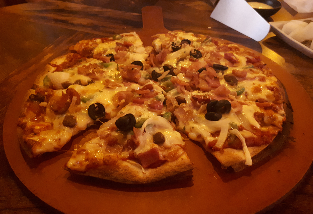 콤비네이션피자가 나왔습니다. 도우가 두껍지 않았고 곁에 면이 살짝 바삭했습니다. 손으로 한 조각을 잡아 앞접시로 옮기고 반으로 접어 입으로 쏘옥!ㅋㅋㅋㅋㅋ 피자 한 조각의 크기는 나눠서 먹으면 3입...? 한 입에도 가능한 크기였습니다.