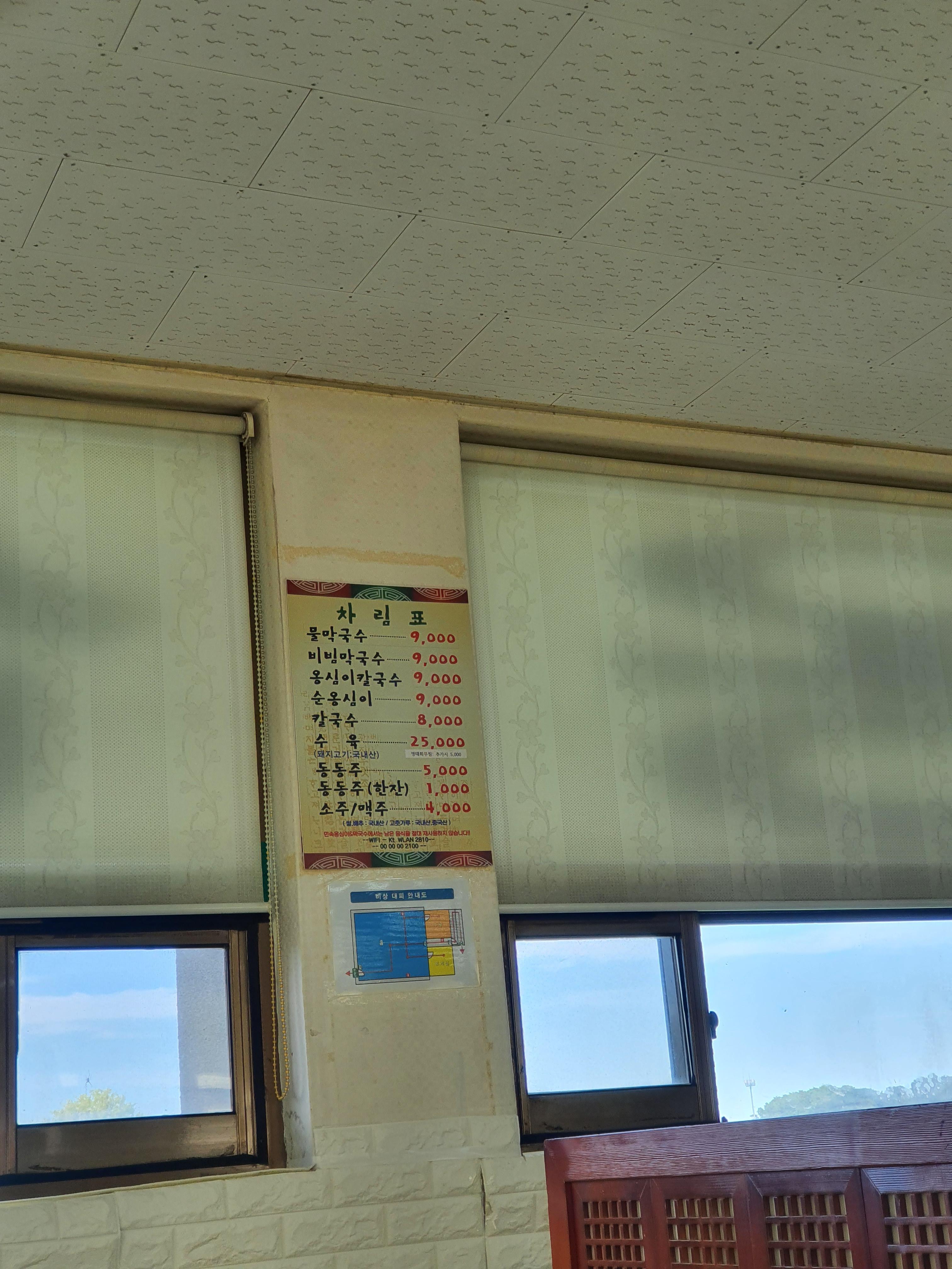 건물을 보면 대충 짐작할 수 있는데, 2층에 들어가면 넓은 공간에 테이블이 쭉있습니다. 브레이크 타임이 딱 끝날 쯤에 가서 그런지 다른 사람이 없었습니다. 편한 자리를 찾아 앉았고 벽에 붙어있는 메뉴판을 살펴보았습니다. 친구는 물막국수, 저는 비빔막국수를 주문했습니다.