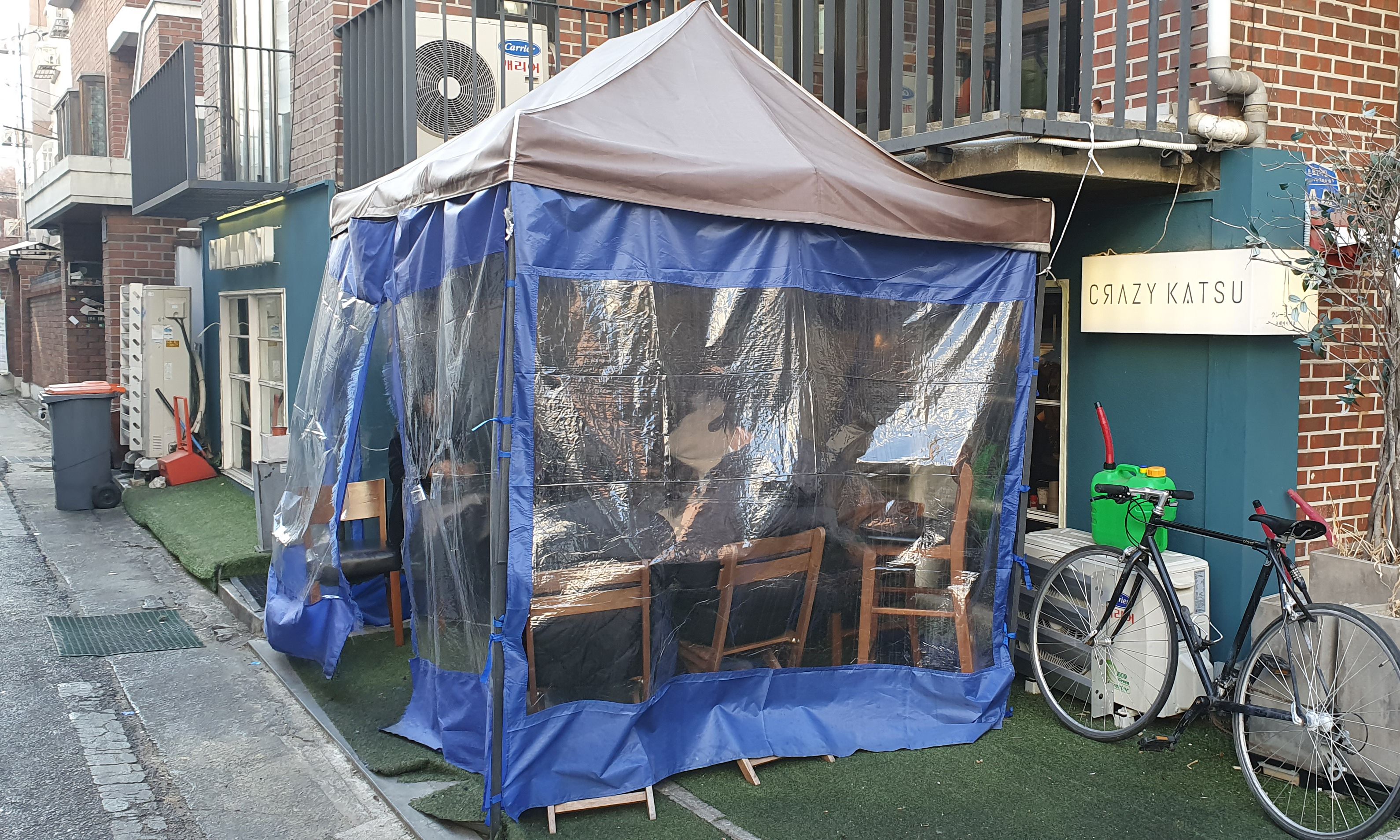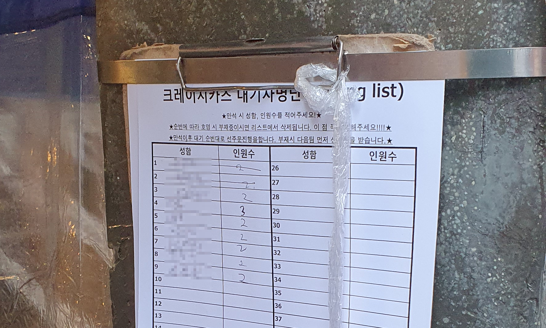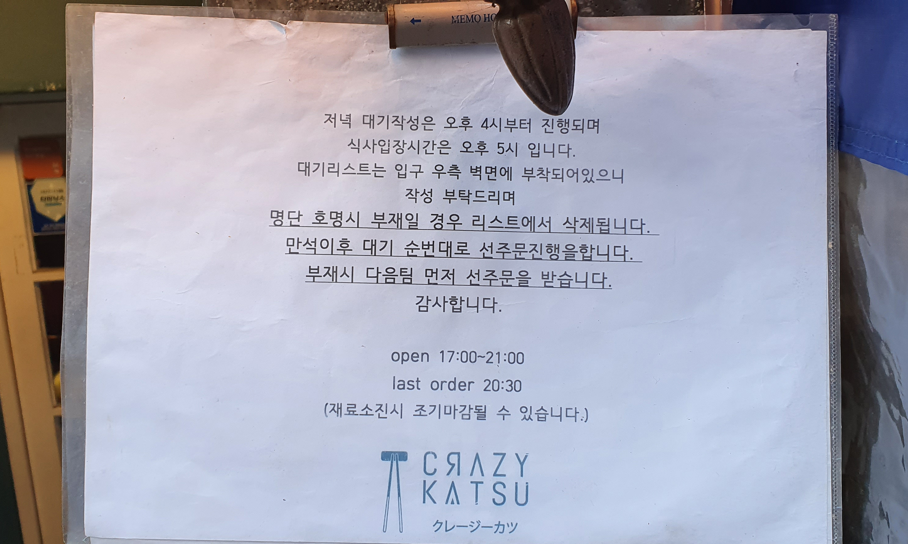 크레이지카츠 대기자 명단에 성함과 인원수를 쓰고 골목에서 대기했습니다. 코로나 19로 인해 그런지 대기자가 많지는 않았습니다. 음식을 주문 받고 음식이 나오는 시간을 고려하여 한 팀, 한 팀 천천히 입장하는 것 같았습니다. 대략 20~30분 정도 기다렸던 것 같네요. 입장~