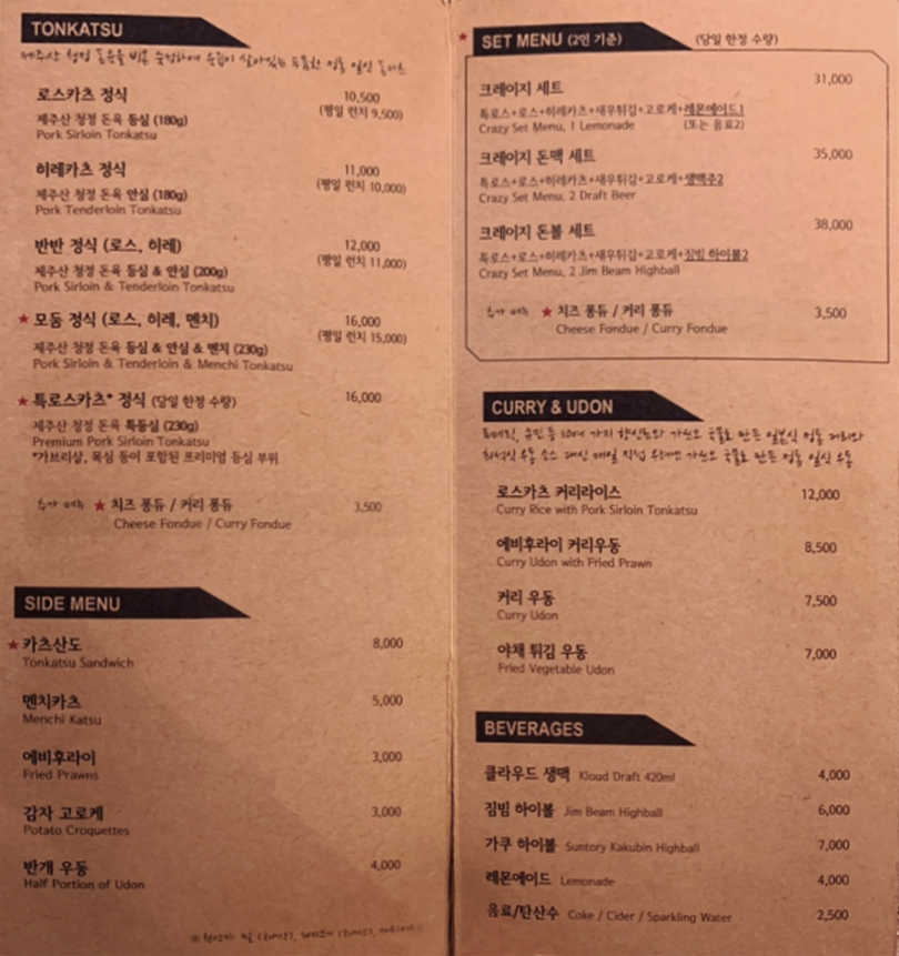 로스카츠 정식 10,500(평일 런치 9,500) / 히레카츠 정식 11,000(평일 런치 10,000) / 반반 정식(로스, 히레) 12,000(평일 런치 11,000) / 모둠 정식(로스, 히레, 멘치) 16,000(평일 런치 15,000) / 특로스카츠 정식(당일 한정수량) 16,000