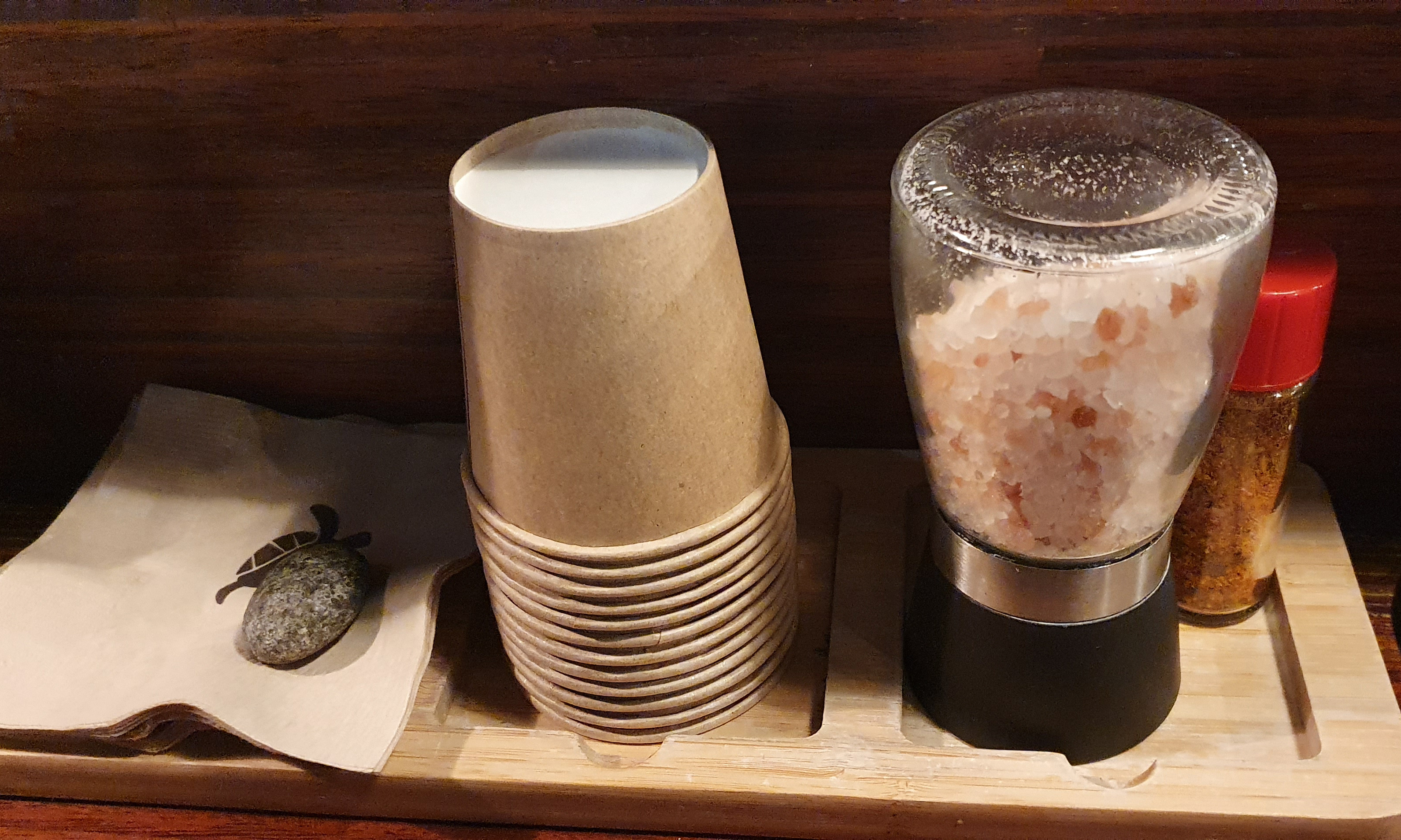 합정 돈까스 맛집 크레이지카츠의 테이블은 마주 앉는 자리는 2자리 정도로 확인이 되고 대부분 나란히 앉는 자리로 되어 있었습니다. 마주 앉는 자리, 나란히 앉는 자리 총해서 대략 16~20명이 앉을 수 있었습니다. 테이블에는 냅킨과 종이컵, 히말라야 염암으로 돈까스를 먹을 때 갈아서 찍어먹도록 되어있었습니다.