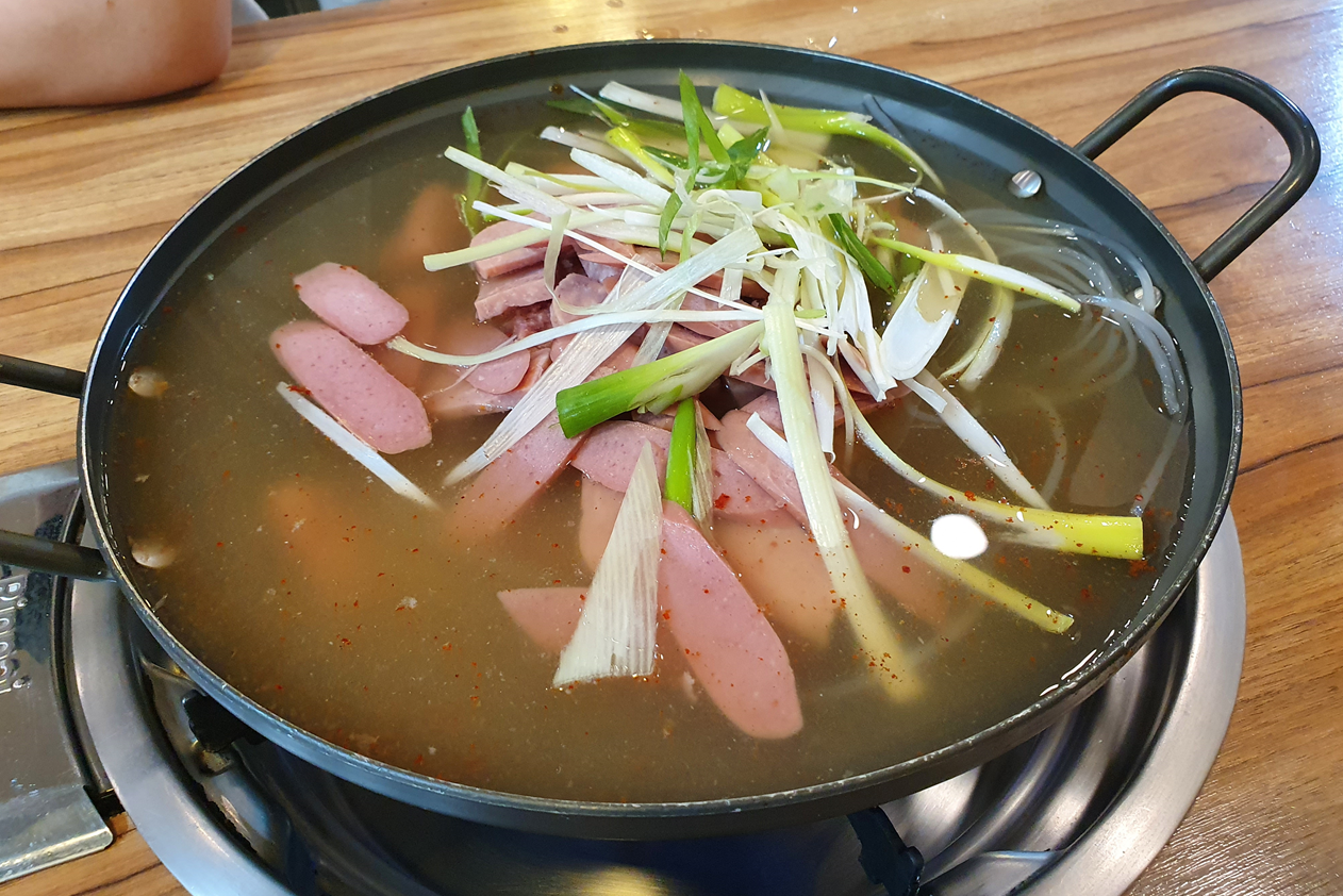 부대찌개는 냄비에 육수 없이 나왔고, 불을 켜기 전에 육수를 먼저 부어주셨습니다. 부어서 가지고 오면 무겁고... 흘릴까봐 그런 듯해 보였습니다.