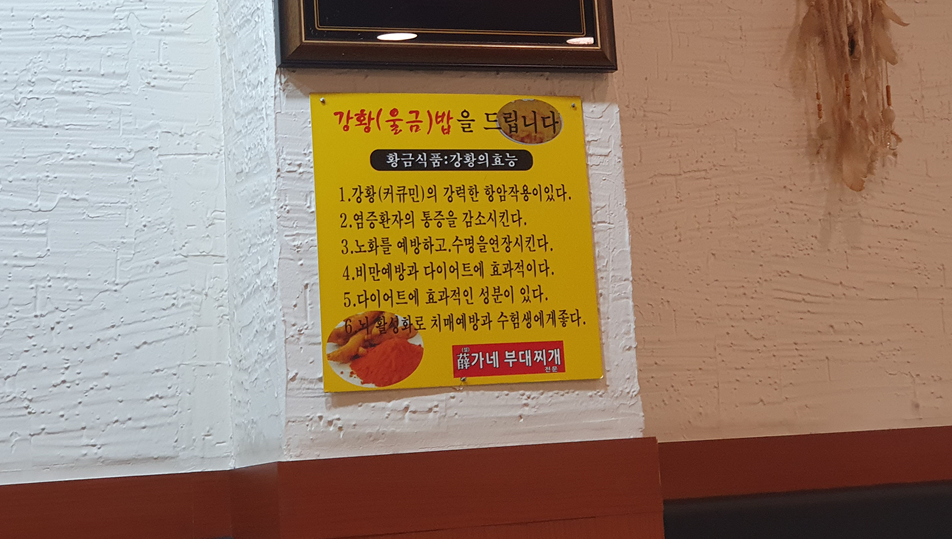 개봉사거리 맛집 설가네 부대찌개의 밥은 강황(울금)밥으로 노란거래요!!! 강황의 효능이 6가지가 있다고 하니 위에 사진을 참고하세요~