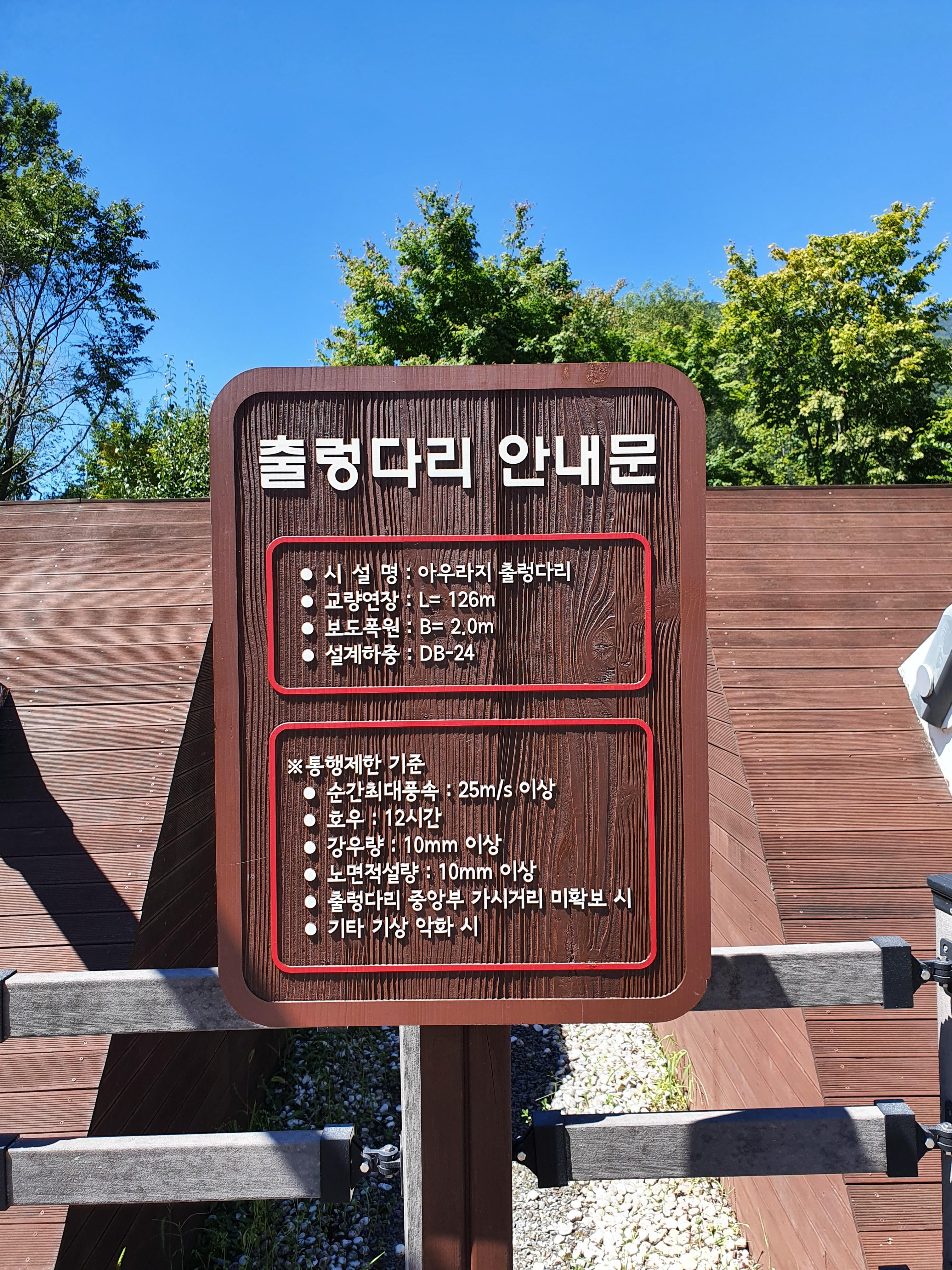 아우라지 출렁다리 앞에는 출렁다리 안내문이 있었습니다. 자세한 내용은 위에 사진을 참고하시면 될 것 같습니다.