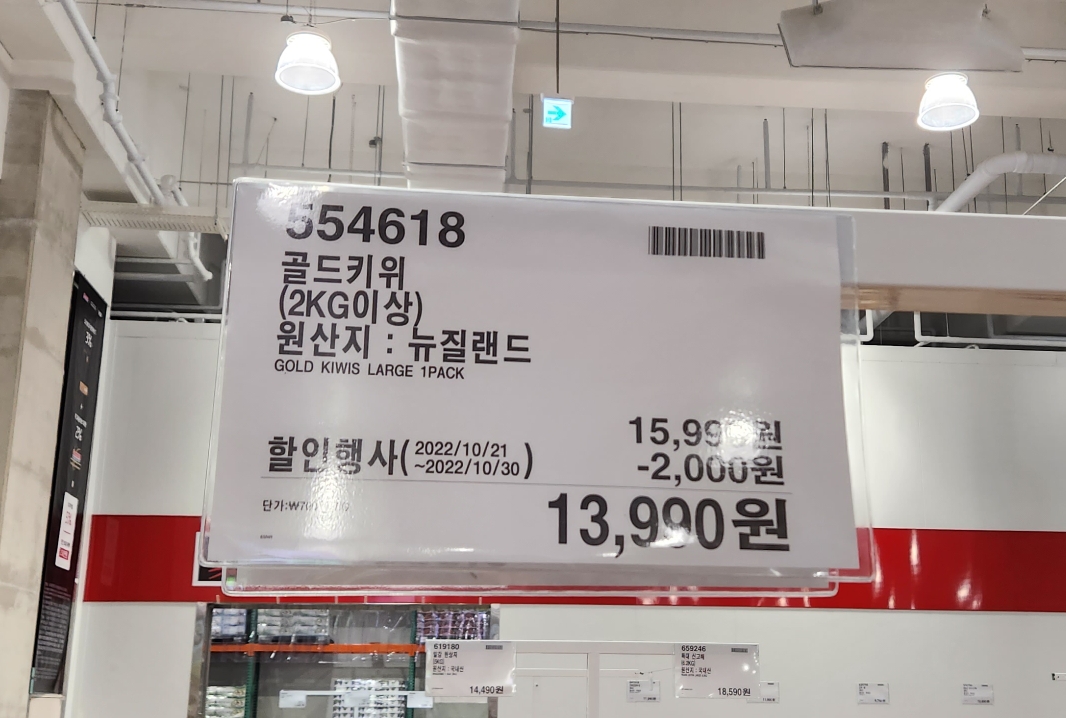 골드키위가 행사를 해서 2000원 할인해 주더라구요. 13990원으로 3통 쌌고 한통에 11개정도 들어있었습니다. 그리고 집에서 먹어보니 달달하고 맛있었습니다.