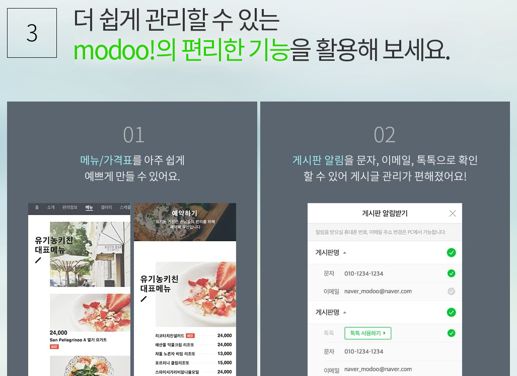 위에 사진에 나온 것과 같이 메뉴/가격표를 예쁘게 꾸밀 수도 있고 게시판 알림을 문자, 이메일, 톡톡으로 확인할 수 있어서 게시글 관리가 편할 것 같았습니다. 그리고 저는 스마트스토어를 사용하고 있는데 스마트스토어와 연동이 되는 것이 가장 좋았습니다.
