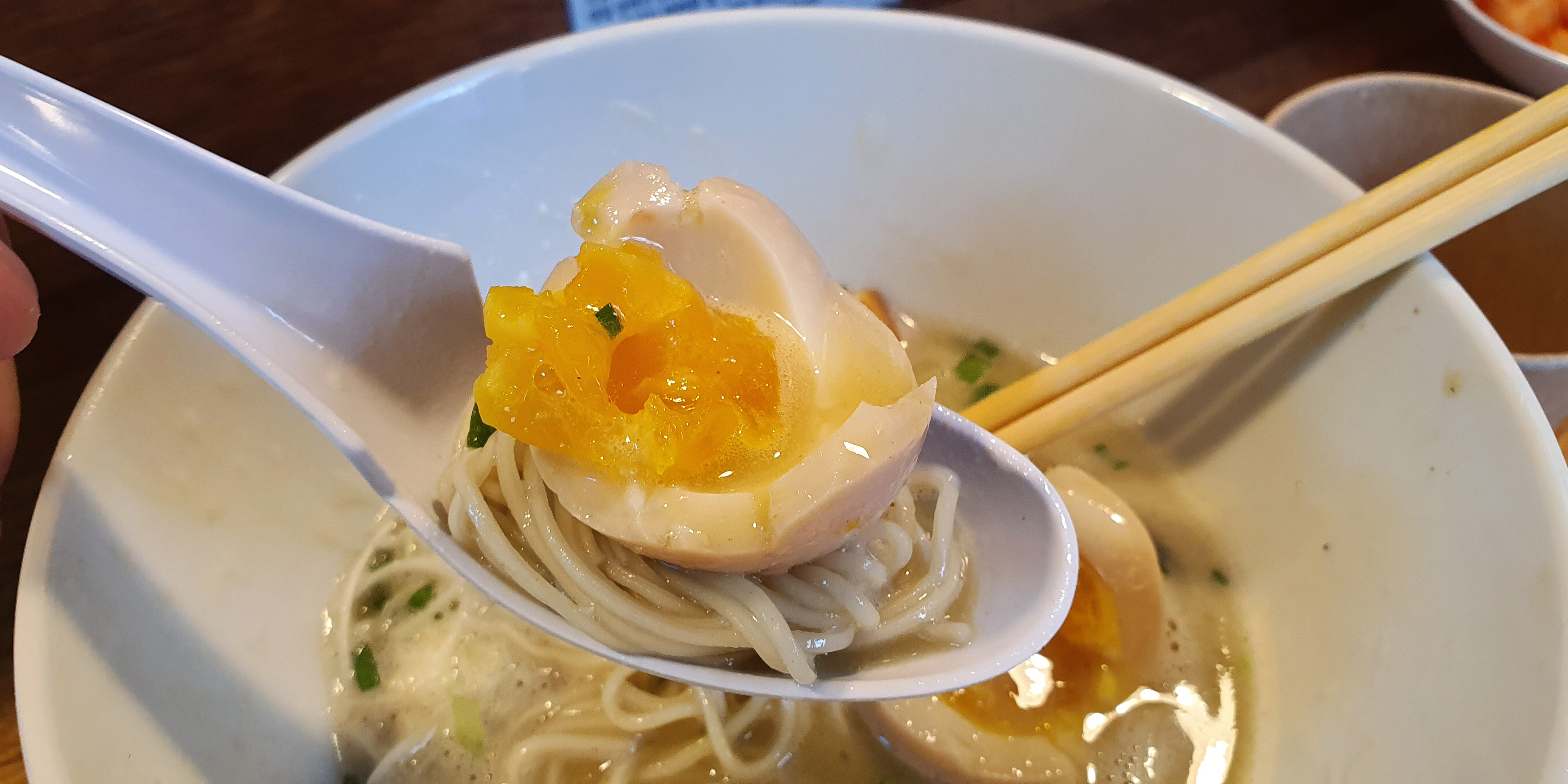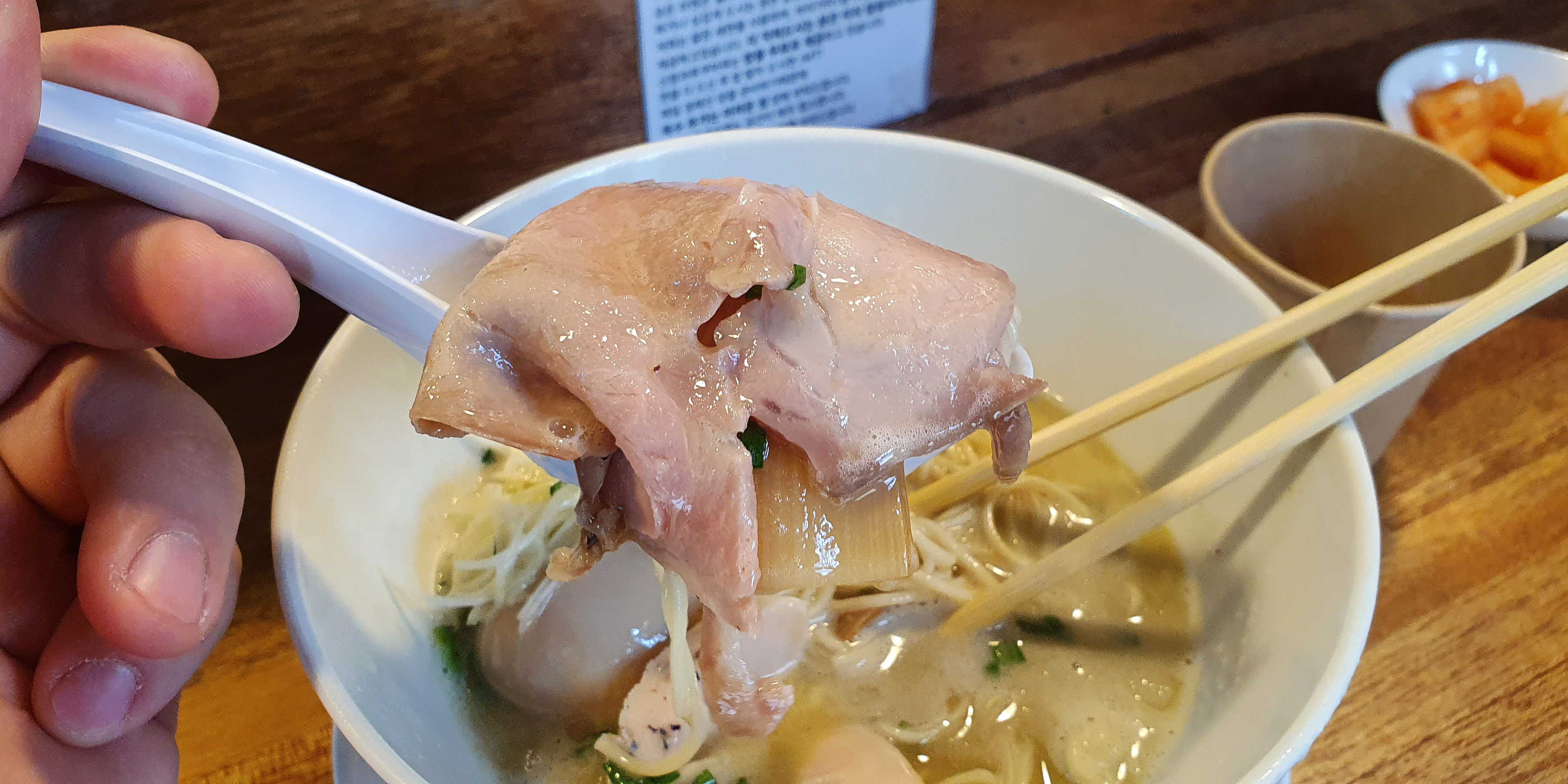면에 토핑을 하나씩 올려 한입에 쏙~ 지금 사진을 보며 먹었을 때를 상상하니 입안에 침이 고이네요. 개인적으로는 계란이 반숙되어있고 약간의 간 되어있어 너무 맛있더라고요. 호로록호로록~ 잘 넘어가네요.