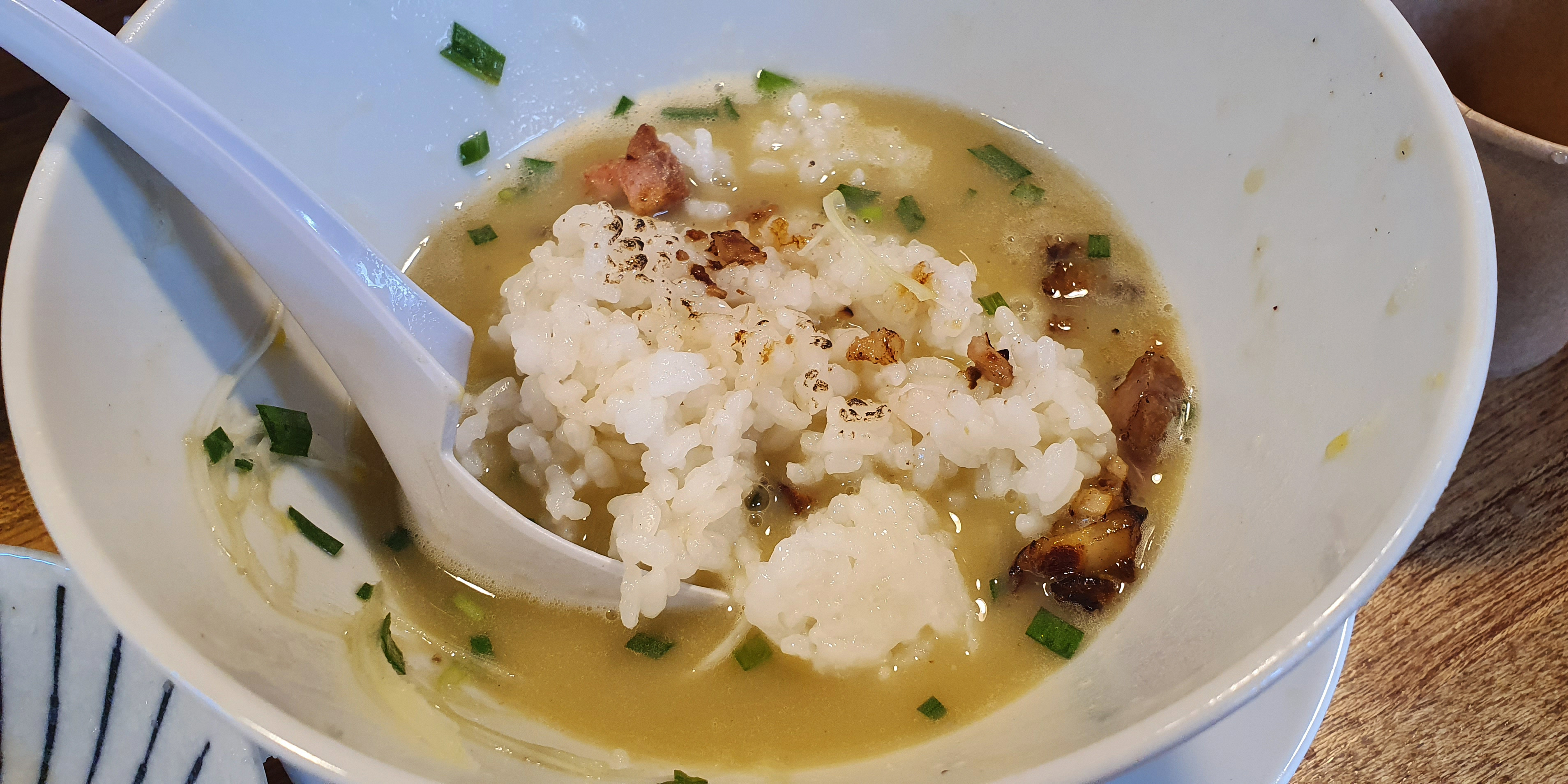 후쿠라멘에 남아있는 국물에 밥을 넣고 말았습니다.